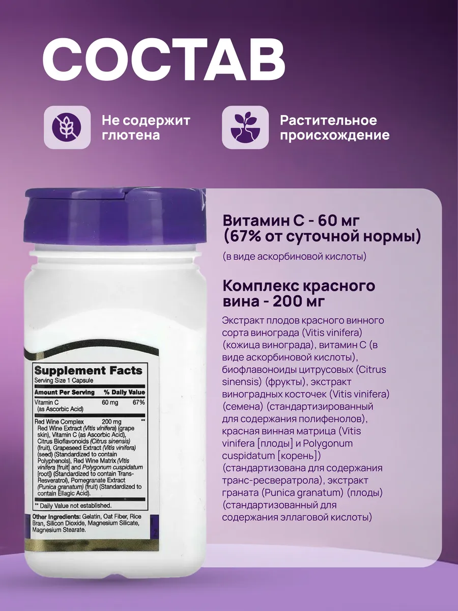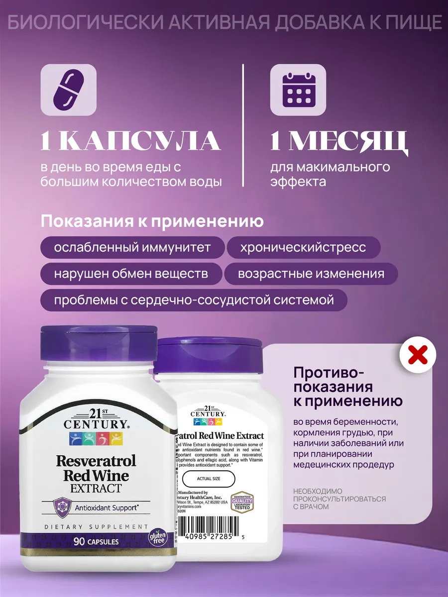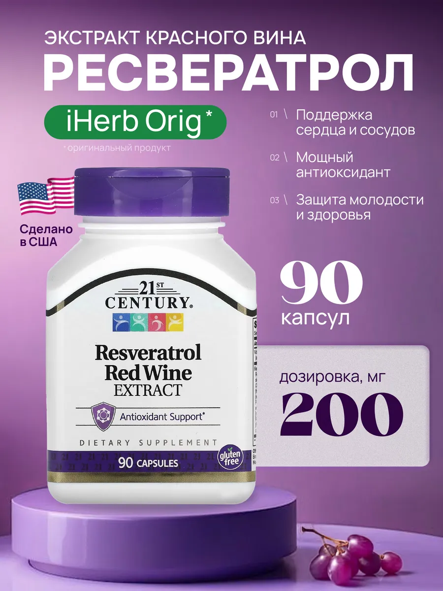 21st Century Ресвератрол — это мощный антиоксидант, полученный из экстракта красного винограда, который способствует защите клеток от окислительного стресса, поддерживает здоровье сердечно-сосудистой системы и замедляет процессы старения.