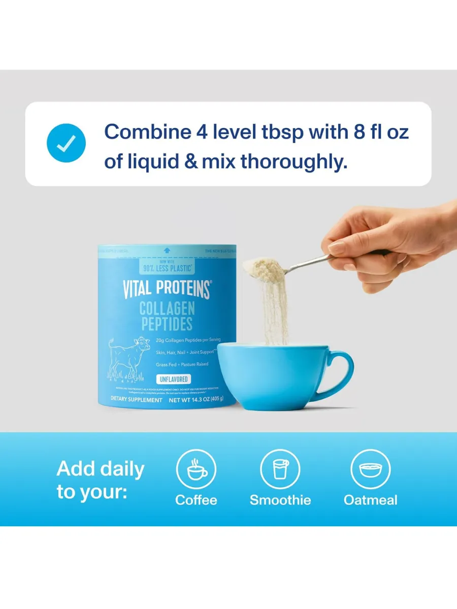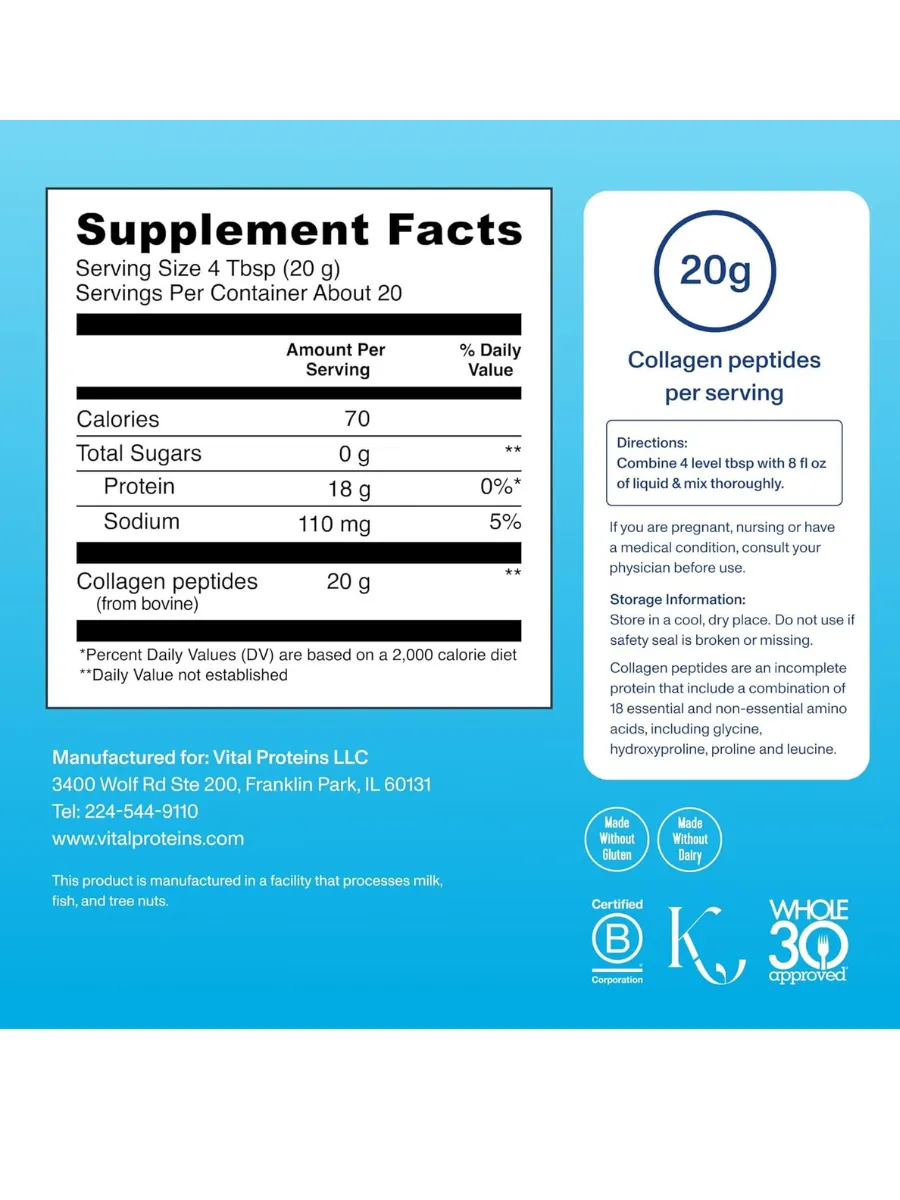 Vital Proteins Collagen Peptides Powder - Grass Fed Collagen Peptides — это коллагеновый комплекс в порошковой форме для поддержки здоровья кожи, волос, ногтей, костей и суставов. Каждая порция (20 г, примерно 2 столовые ложки) содержит 20 г гидролизованных коллагеновых пептидов, полученных из шкур крупного рогатого скота, выращенного на пастбищах. Продукт не имеет вкуса, легко растворяется в горячих или холодных напитках и разработан для ежедневного ухода. Не содержит ГМО, глютен, молочные продукты, искусственные ароматизаторы или консерванты, подходит для палео- и кето-диет и сертифицирован по стандартам GMP.