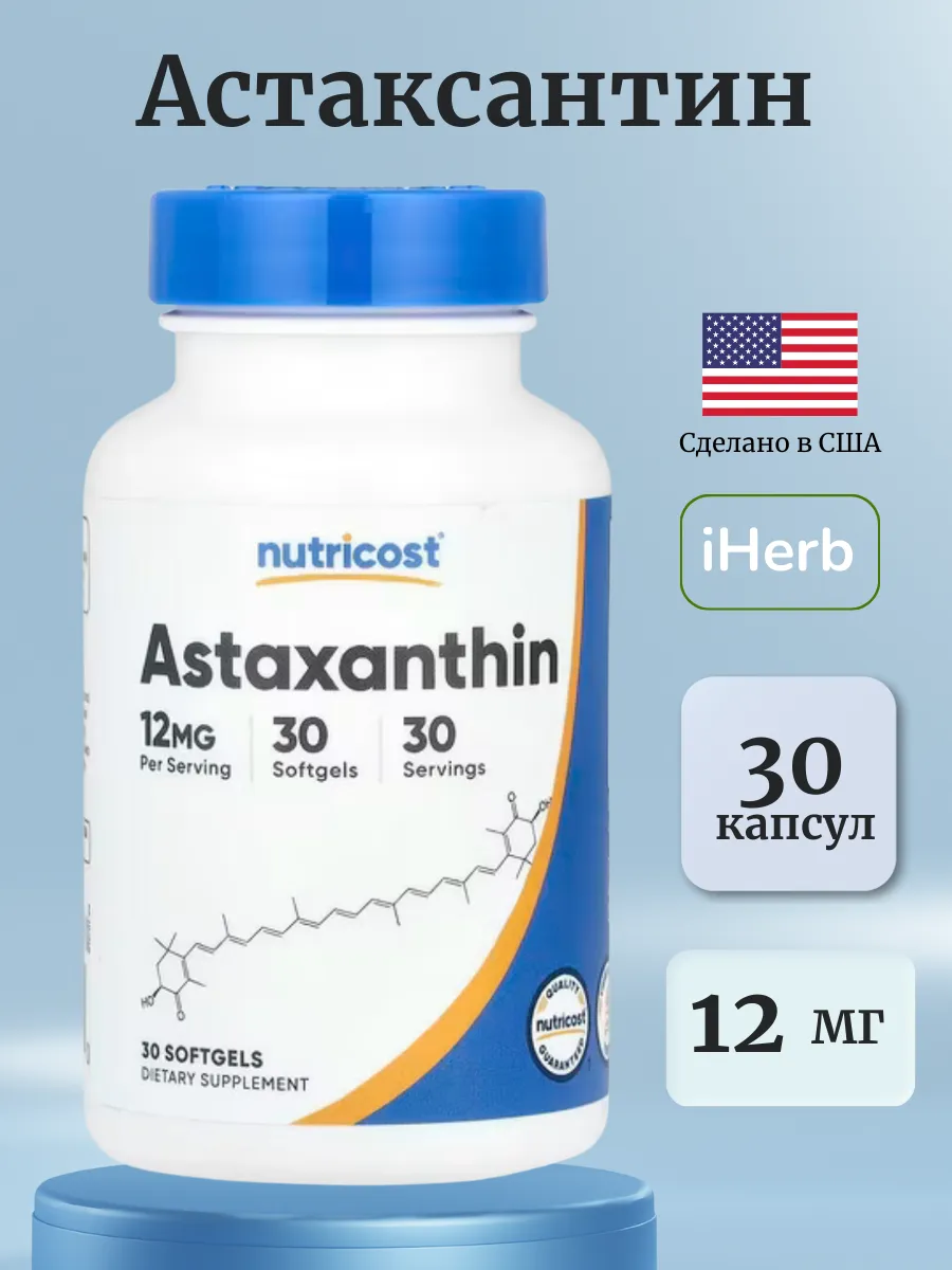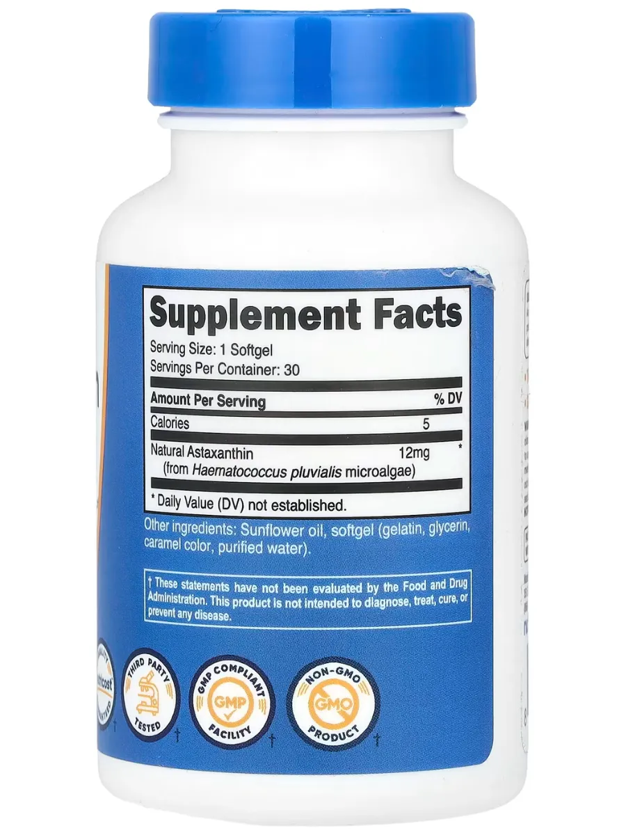 Nutricost Astaxanthin — это мощный антиоксидантный комплекс для защиты клеток, поддержки зрения, кожи и общего здоровья. Каждая порция (1 мягкая капсула) содержит 12 мг астаксантина, полученного из натурального источника Haematococcus pluvialis (микроводоросли), — одного из самых сильных природных антиоксидантов (в 6000 раз сильнее витамина C по нейтрализации свободных радикалов). Продукт помогает уменьшить окислительный стресс, поддержать здоровье глаз (защита сетчатки), улучшить эластичность кожи и ускорить восстановление после тренировок. Не содержит ГМО, глютен, искусственные красители или консерванты, произведён в сертифицированном GMP-объекте с независимым тестированием.