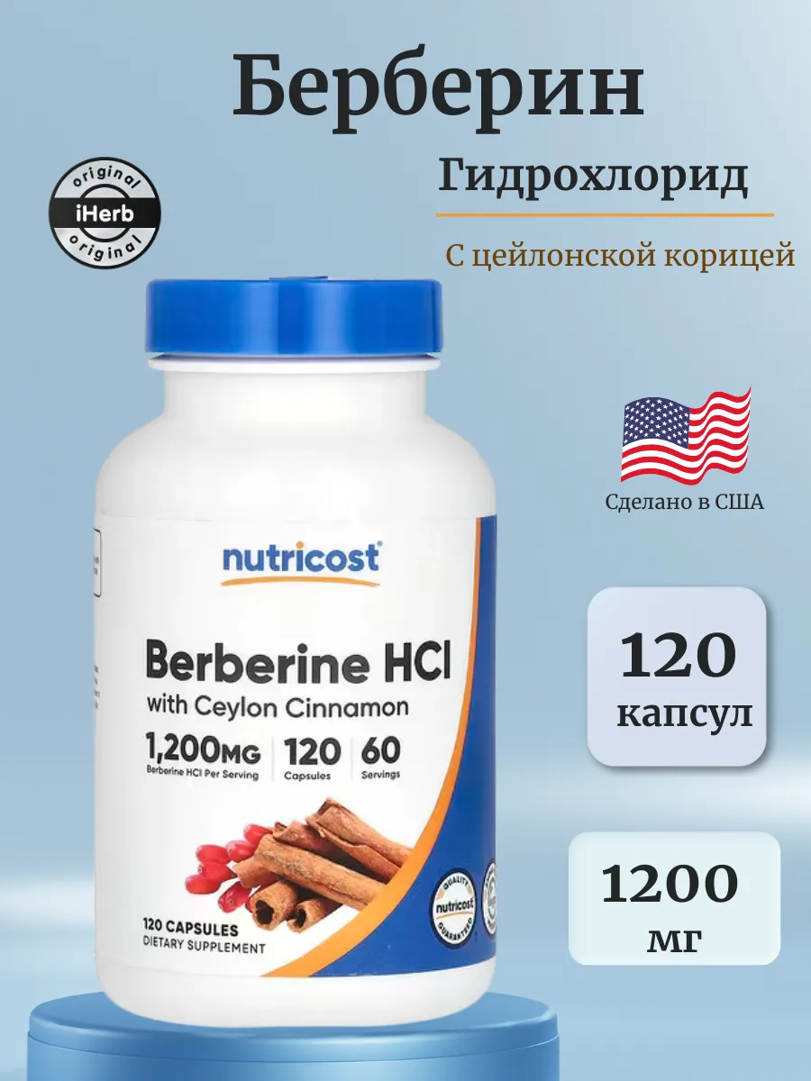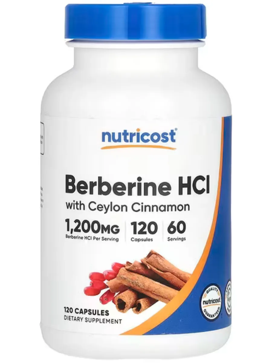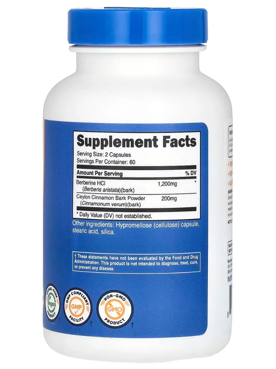 Nutricost Berberine Hydrochloride with Ceylon Cinnamon — это растительный комплекс для поддержки здоровья и общего благополучия. Каждая порция (2 капсулы) содержит 1200 мг берберина гидрохлорида (по 600 мг на капсулу) и цеялонскую корицу, которые работают синергетически для поддержки здорового уровня сахара в крови и обмена веществ. Продукт разработан для укрепления иммунной системы и улучшения пищеварения. Не содержит ГМО, глютен, подходит для веганов и произведён в соответствии с высокими стандартами качества в сертифицированном GMP-объекте с независимым тестированием.