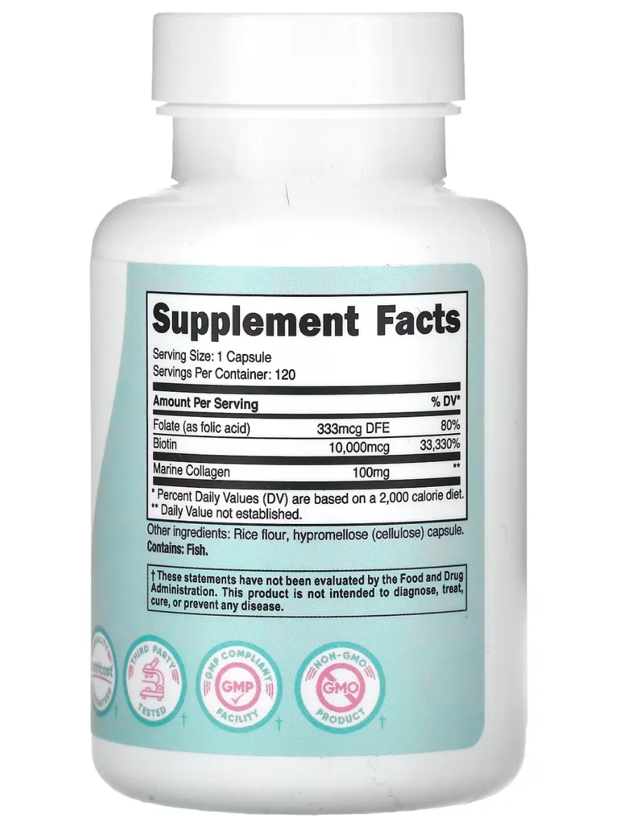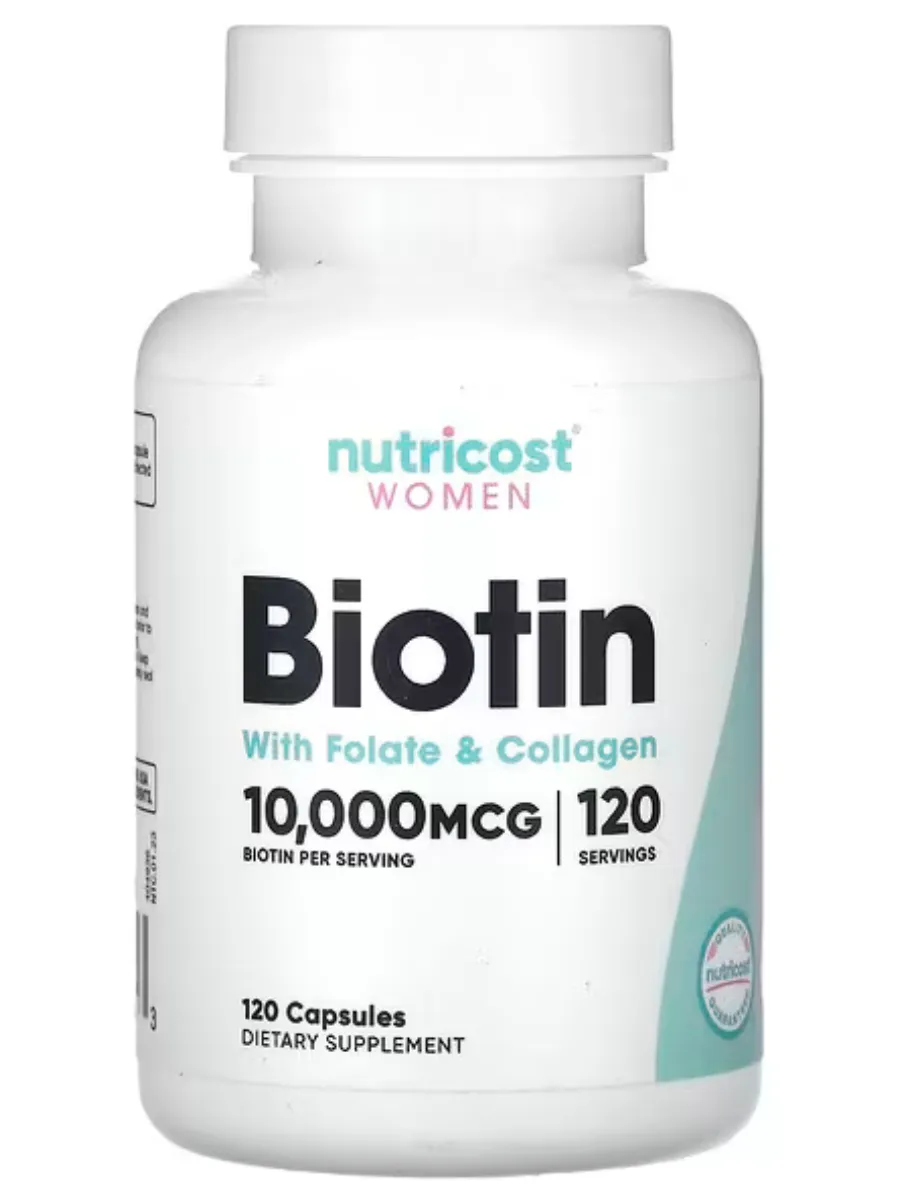 Nutricost Biotin with Folate & Collagen for Women — это добавка, разработанная специально для женского здоровья, для поддержки красоты и общего состояния организма. Каждая порция (1 капсула) содержит 10 000 мкг биотина, 400 мкг фолата (витамина B9) и морской коллаген для укрепления волос, кожи и ногтей. Продукт способствует здоровому метаболизму и поддерживает репродуктивное здоровье благодаря фолату. Не содержит ГМО, глютен, произведён в сертифицированном GMP-объекте с независимым тестированием.
