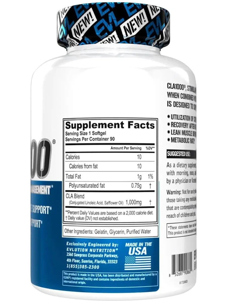 EVLution Nutrition CLA1000 — это средство для коррекции веса без стимуляторов, разработанное для поддержки управления весом и улучшения состава тела. Каждая порция (1 капсула) содержит 1000 мг конъюгированной линолевой кислоты (CLA), полученной из натурального масла сафлора, что способствует использованию запасов жира как источника энергии и сохранению мышечной массы. Продукт разработан для дополнения здорового питания и тренировок, не содержа стимуляторов, что делает его подходящим для использования в любое время дня. Не содержит ГМО, глютен, искусственные красители или консерванты, сертифицирован по стандартам GMP.