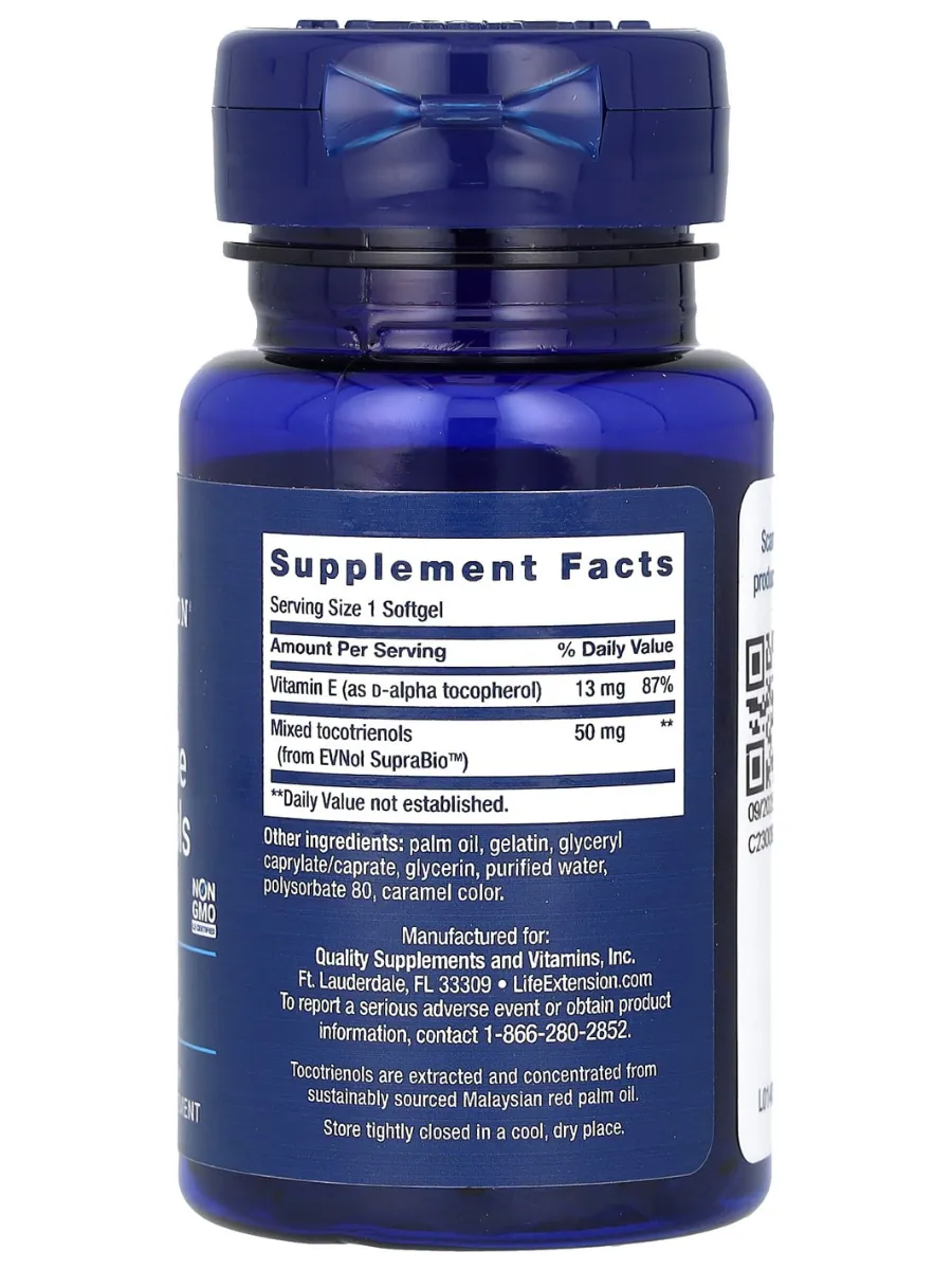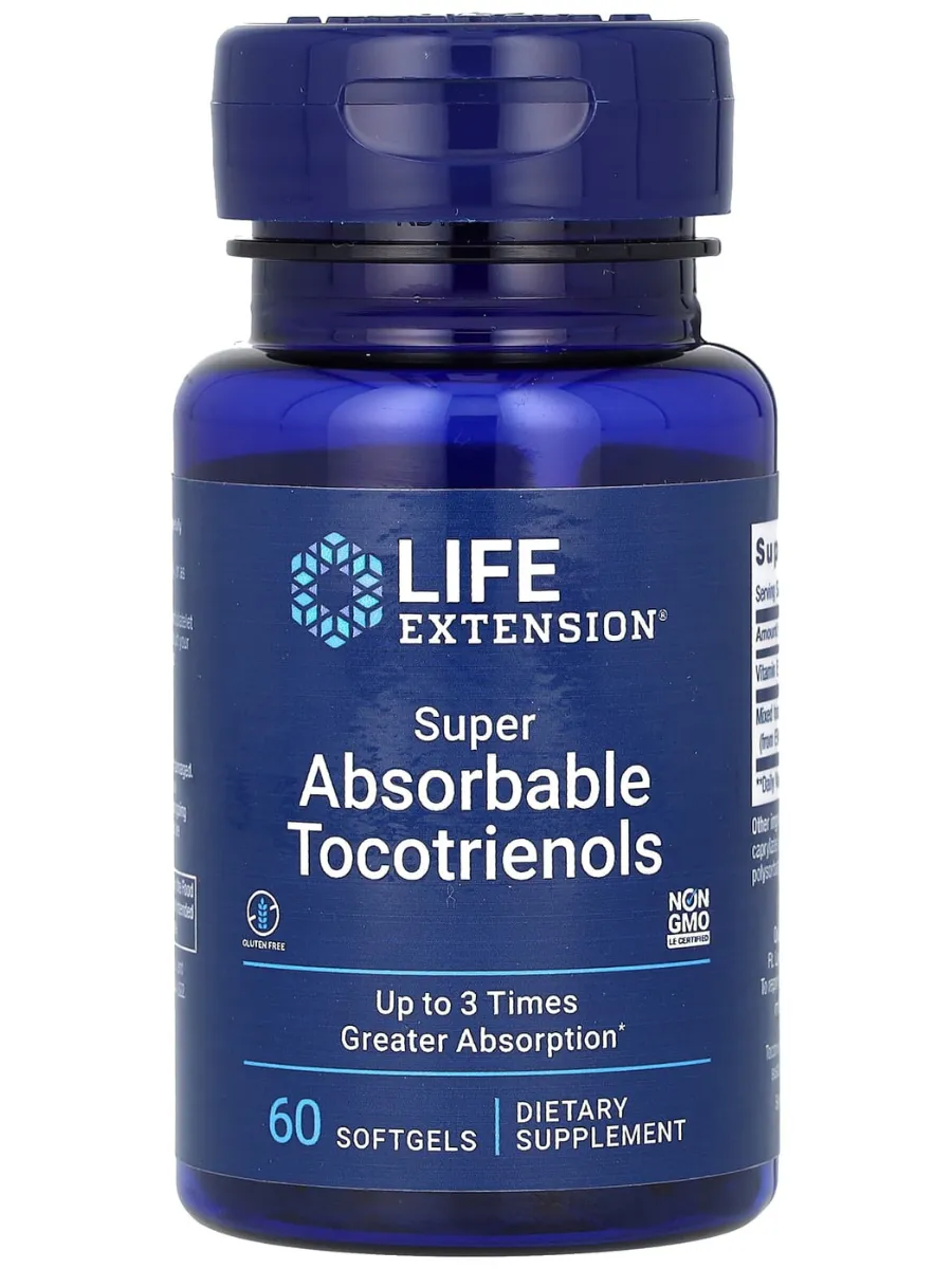 Life Extension Superabsorbable Tocotrienols — это антиоксидантный комплекс на основе токотриенолов для поддержки здоровья сердца, мозга и иммунной системы. Каждая порция (1 капсула) содержит 20 мг витамина E в форме D-альфа-токофенола и минимум 50 мг токотриенолов, полученных из красного пальмового масла Elaeis guineensis, с улучшенной усвояемостью благодаря патентованной системе SupraBio. Продукт способствует защите клеточных мембран, поддержке здорового уровня липидов в крови и росту волос. Не содержит ГМО, глютен, искусственные красители или консерванты, сертифицирован по стандартам GMP.