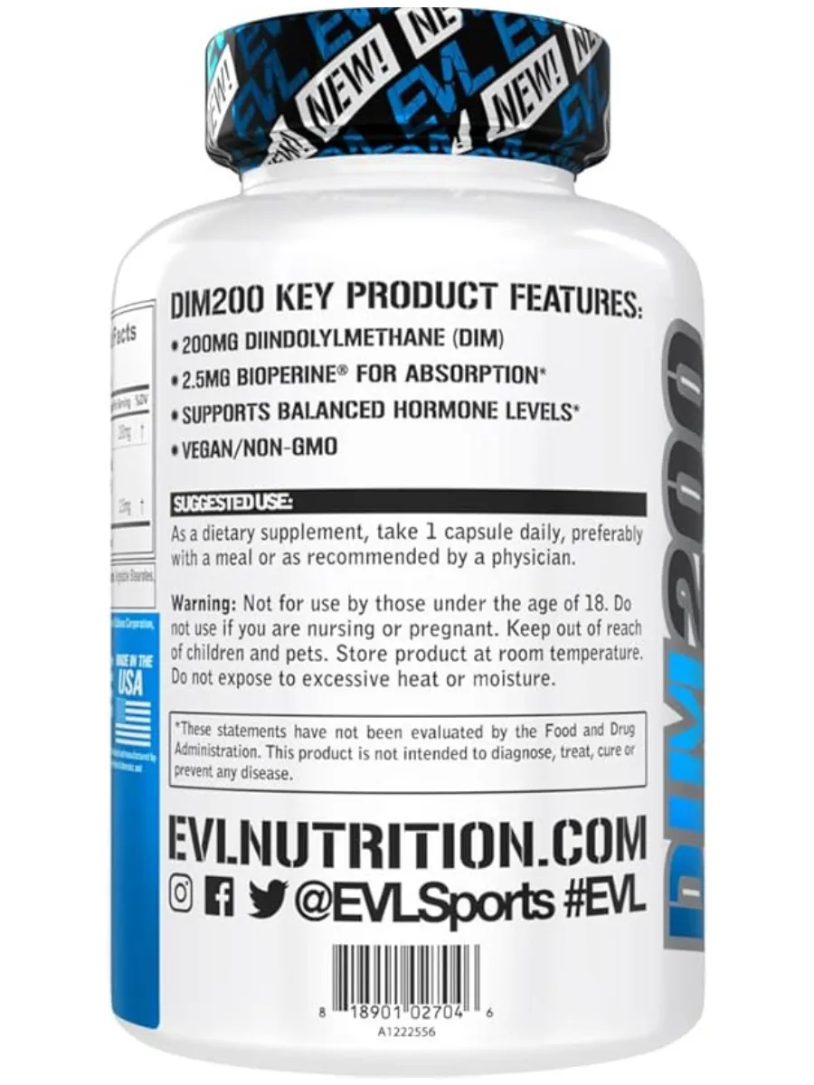 EVLution Nutrition DIM 200 — это растительный комплекс для поддержки гормонального баланса и здоровья. Каждая порция (1 капсула) содержит 200 мг дииндолилметана (DIM), природного соединения, полученного из крестоцветных овощей, и 2,5 мг BioPerine для улучшения усвоения. Продукт помогает поддерживать здоровый метаболизм эстрогена и способствует общему благополучию. Не содержит ГМО, глютен, искусственные красители или консерванты, подходит для веганов и сертифицирован по стандартам GMP.
