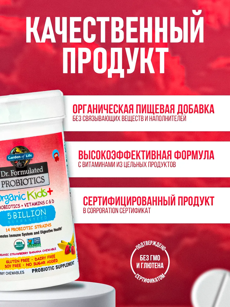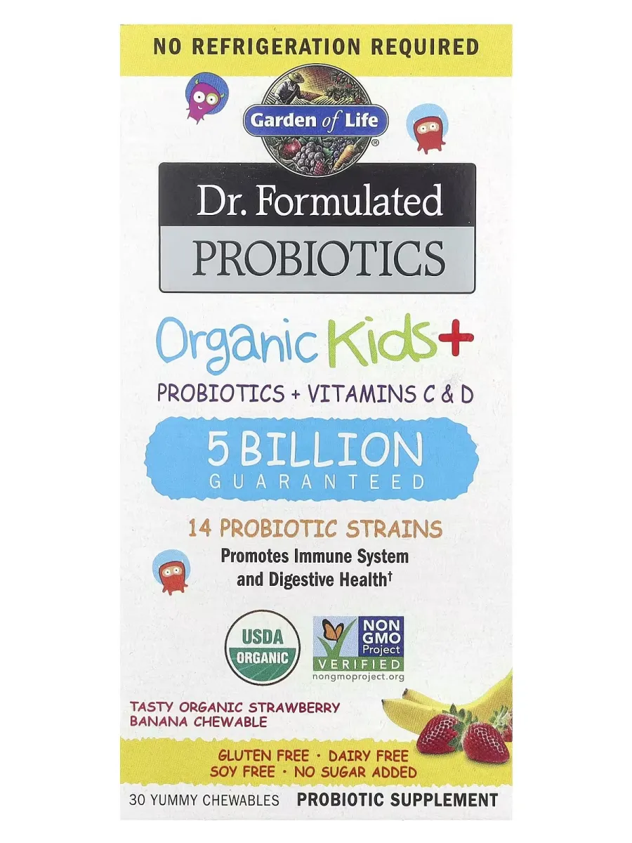 Garden of Life Dr. Formulated Probiotics Organic Kids+ — это комплекс пробиотиков, витаминов и пребиотиков, разработанный для поддержки иммунной и пищеварительной систем детей. Формула включает 5 миллиардов КОЕ из 14 штаммов пробиотиков, витамины C и D из цельных органических источников, а также органические пребиотики для поддержания здоровья кишечника.