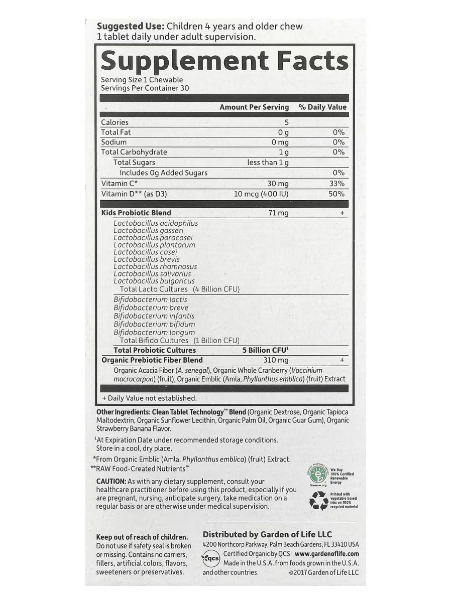 Пробиотическая смесь (Lactobacillus acidophilus, L. gasseri, L. paracasei, L. plantarum, L. casei, L. brevis, L. rhamnosus, L. salivarius, L. bulgaricus, Bifidobacterium lactis, B. breve, B. infantis, B. bifidum, B. longum), витамин C (из органической амлы), витамин D3 (из культуры Saccharomyces cerevisiae), органическая пребиотическая смесь (акация, цельная клюква), органические ароматизаторы (ягоды и вишня), органический экстракт стевии.