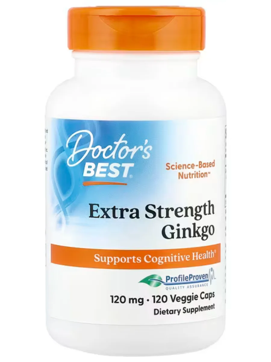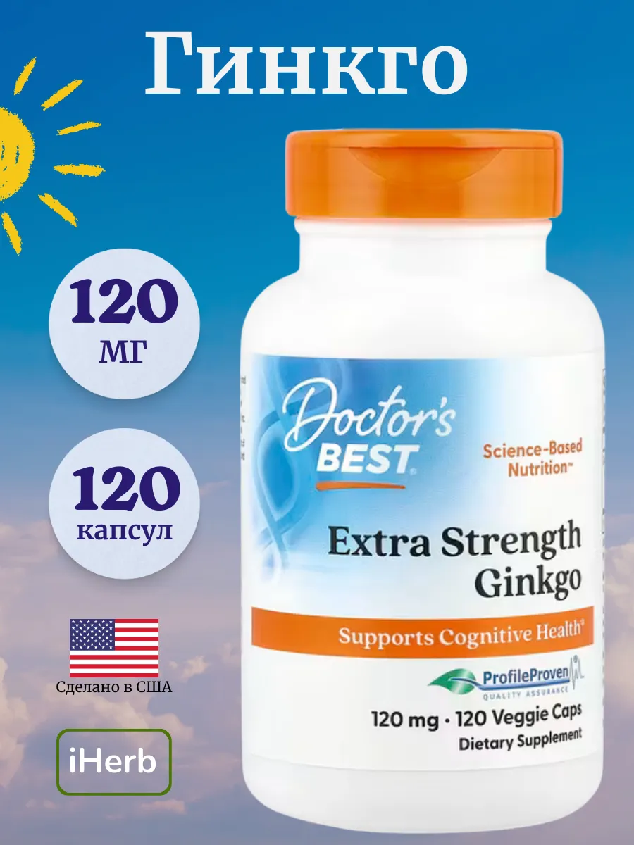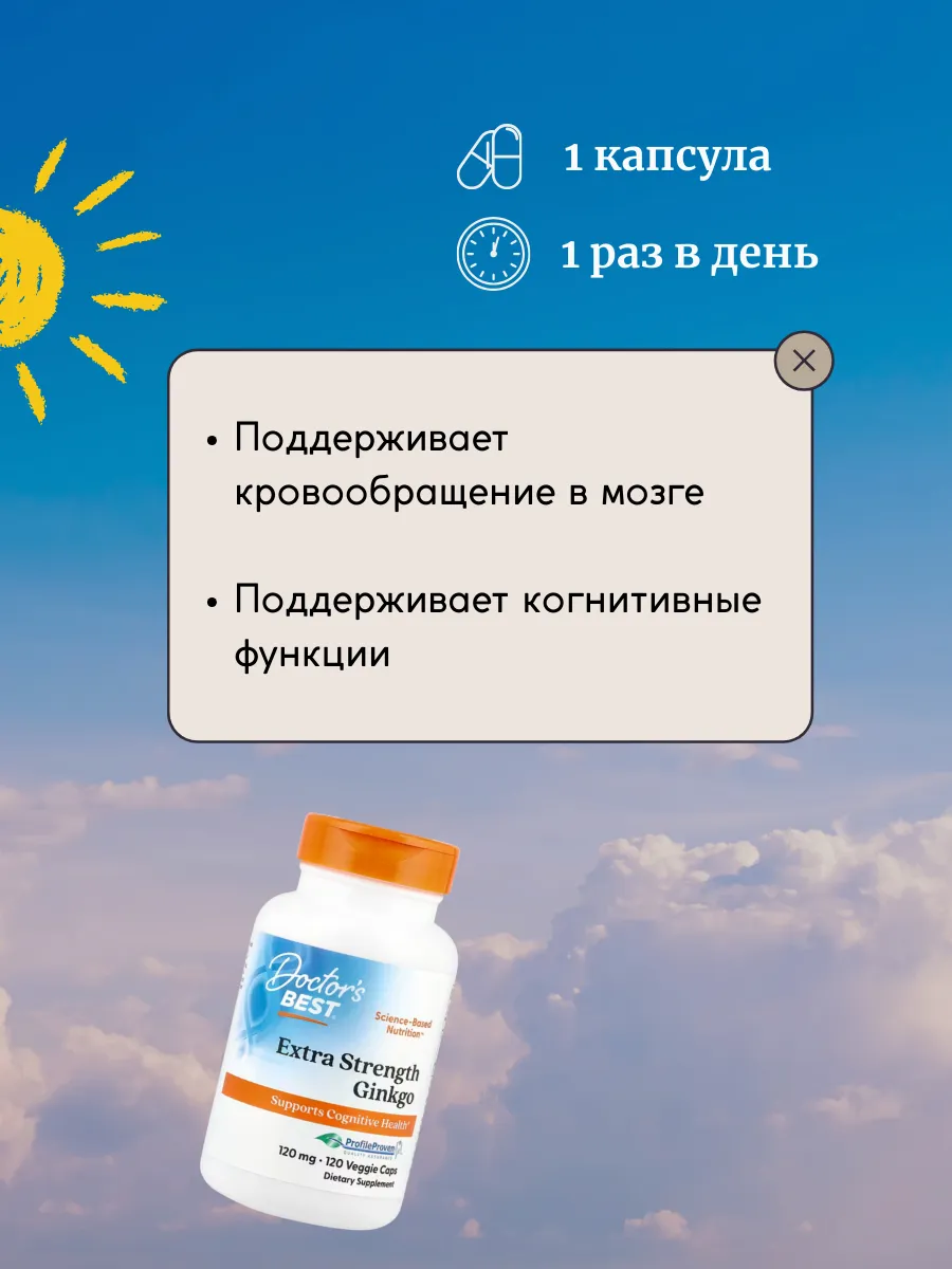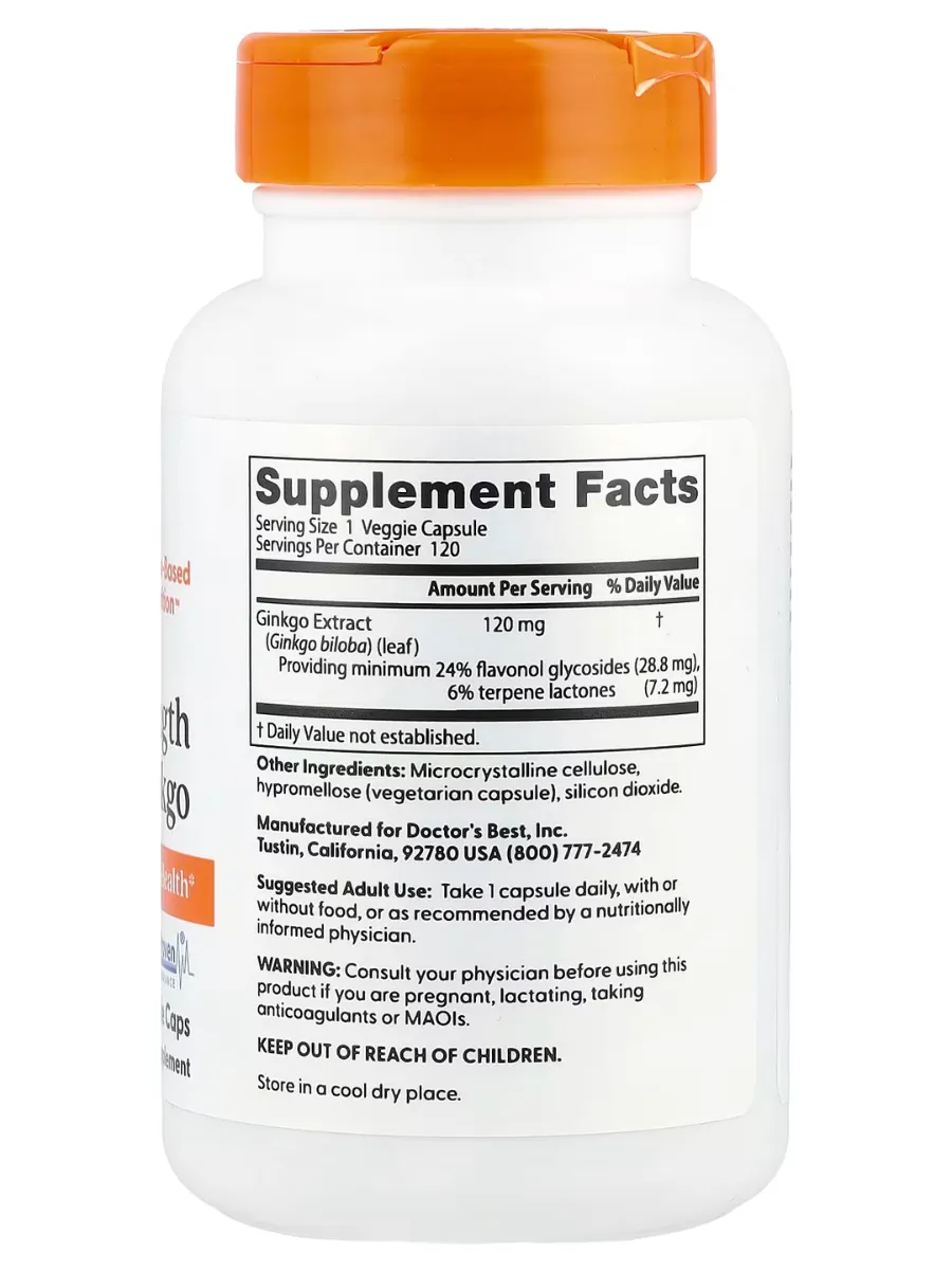 Doctor's Best Extra Strength Ginkgo — это мощный растительный комплекс для поддержки когнитивных функций, памяти и кровообращения мозга. Каждая порция (1 вегетарианская капсула) содержит 120 мг стандартизированного экстракта гинкго билоба (Ginkgo biloba) с 24% флавонгликозидов и 6% терпеновых лактонов, что обеспечивает максимальную концентрацию активных веществ. Продукт разработан для улучшения концентрации, памяти, мозгового кровотока и защиты клеток мозга от окислительного стресса. Не содержит ГМО, глютен, сою, искусственные красители или консерванты, подходит для вегетарианцев и сертифицирован по стандартам GMP.