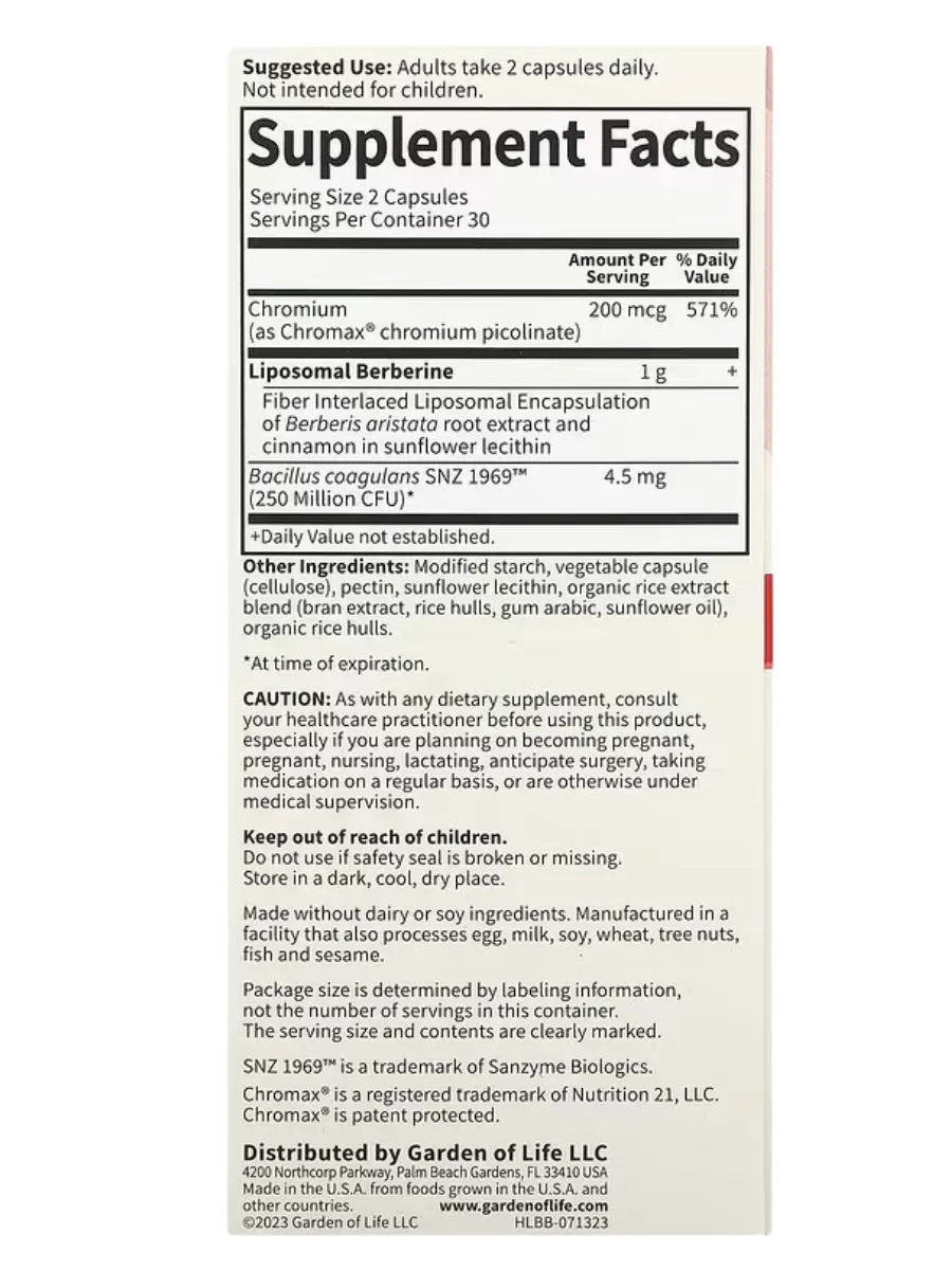 Garden of Life Herbals Liposomal Berberine — это комплексная формула для поддержки здорового уровня глюкозы в крови и метаболизма, созданная на основе клинически изученных ингредиентов. Каждая порция (2 капсулы) содержит 1 г липосомального берберина, мощного растительного соединения, которое поддерживает нормальный уровень сахара и холестерина в крови, а также 200 мкг Chromax (хрома пиколината) для уменьшения тяги к углеводам. Продукт включает пробиотики Bacillus coagulans SNZ 1969 (250 миллионов КОЕ) для улучшения пищеварения. Не содержит ГМО, глютен, сою, молочные продукты, искусственные красители, наполнители или консерванты, подходит для веганов и сертифицирован по стандартам Non-GMO Project, NSF Gluten-Free и кошерности.