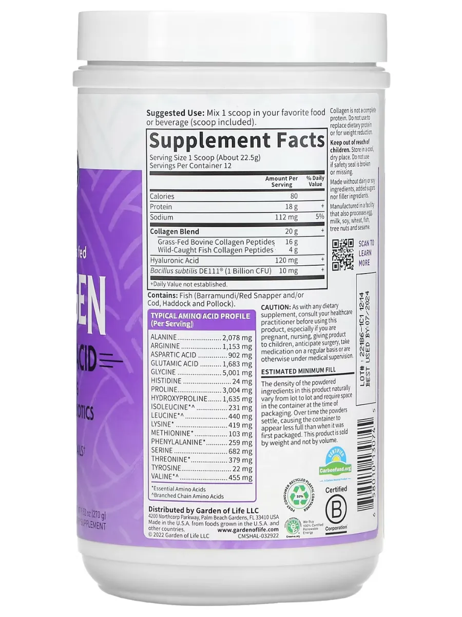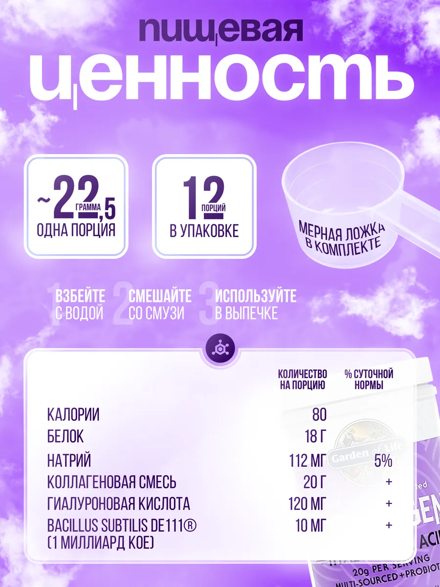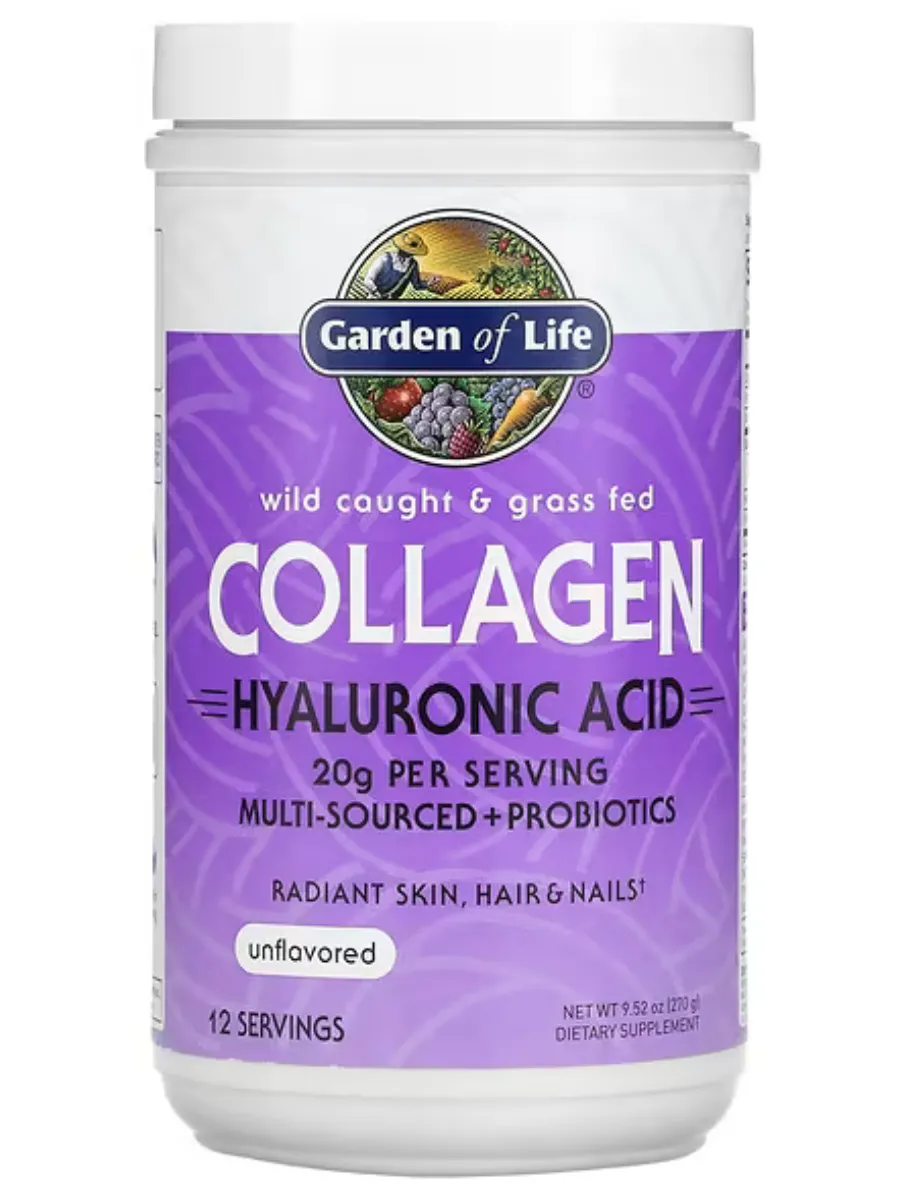 Коллаген Garden of Life с гиалуроновой кислотой — это комбинированный источник коллагеновых пептидов типов I и III из дикого морского улова и говядины травяного откорма. Продукт разработан для поддержания здоровья кожи, волос, ногтей, суставов и улучшения гидратации кожи.
