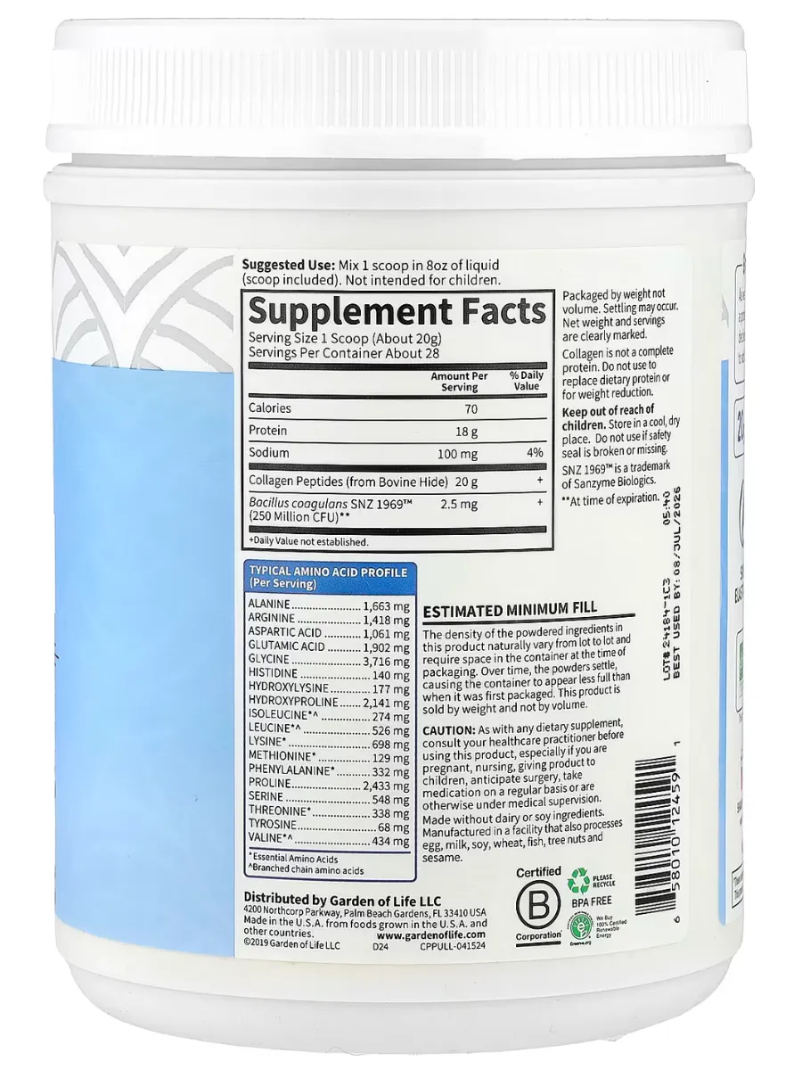 Коллагеновые пептиды Garden of Life — это высококачественный белковый порошок, разработанный для поддержки здоровья кожи, волос, ногтей, суставов и пищеварения. Продукт содержит 20 г коллагена типов I и III из говядины травяного откорма, а также пробиотик Lactobacillus plantarum для дополнительной пользы.