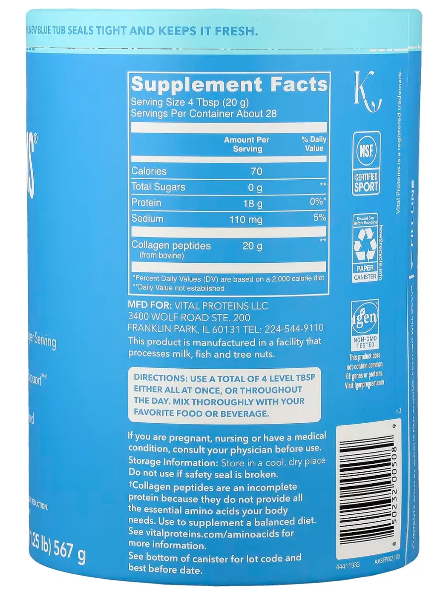 Vital Proteins Пептиды Коллагена — это высококачественный гидролизованный коллаген, который поддерживает здоровье кожи, суставов, волос, ногтей и костей. Этот продукт легко растворяется в горячих и холодных жидкостях, не имеет вкуса и запаха, что делает его удобным для ежедневного использования.