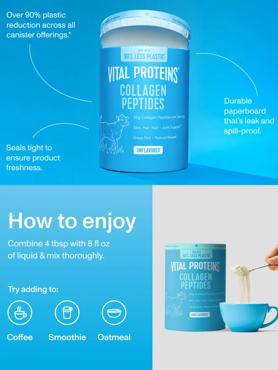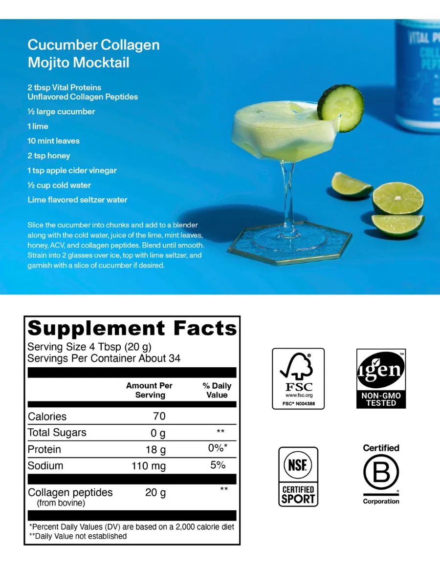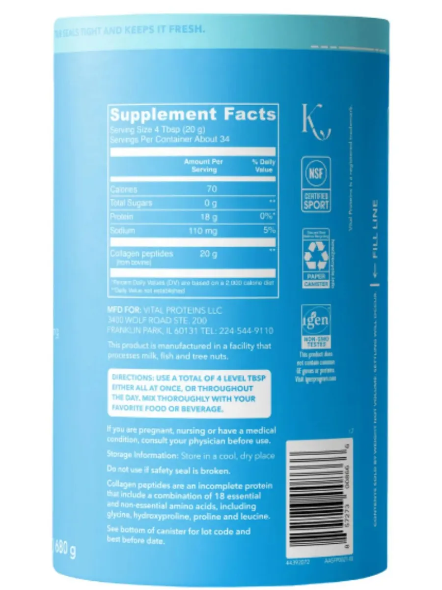 Vital Proteins Пептиды Коллагена — это гидролизованный коллаген высочайшего качества, поддерживающий здоровье кожи, суставов, волос, ногтей и костей. Благодаря гидролизованной форме, коллаген легко усваивается организмом, обеспечивая максимальную эффективность.