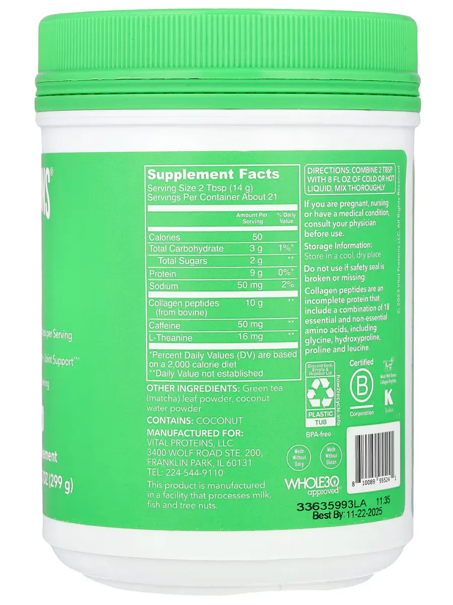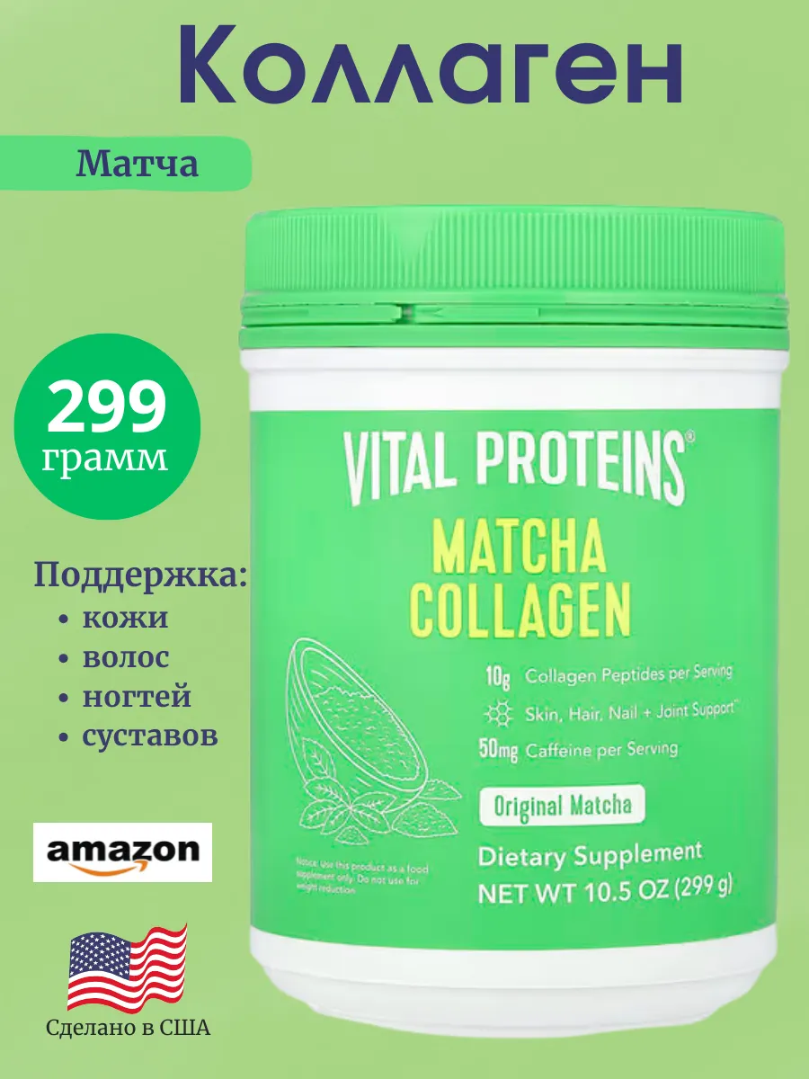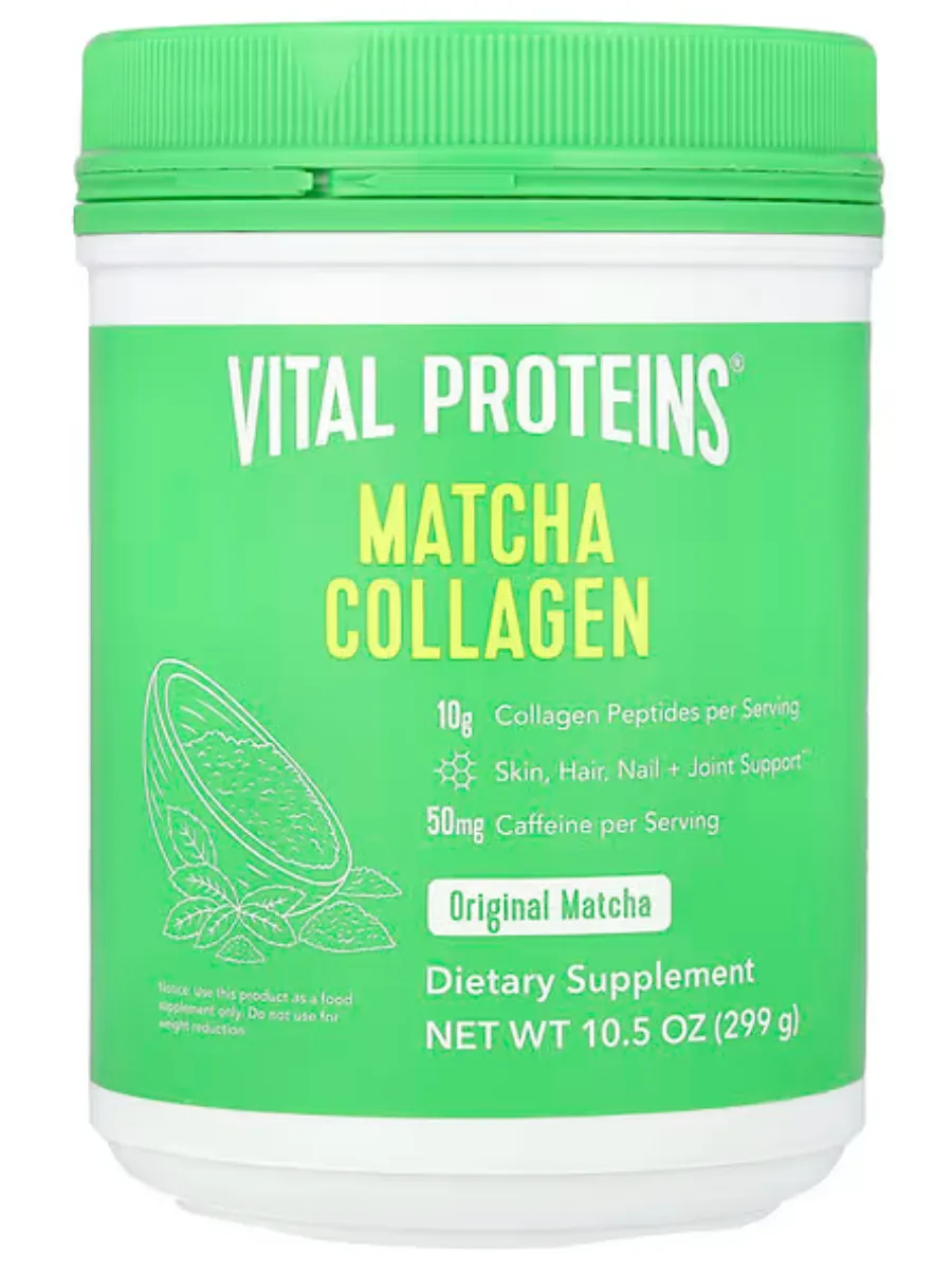 Vital Proteins Коллаген Матча — это пищевая добавка, сочетающая в себе высококачественный японский зелёный чай матча и пептиды коллагена, полученные из шкур крупного рогатого скота, выращенного на пастбищах. Продукт разработан для поддержки здоровья кожи, волос, ногтей, суставов и костей, а также для обеспечения естественного прилива энергии.