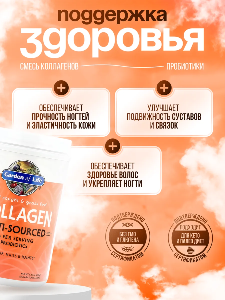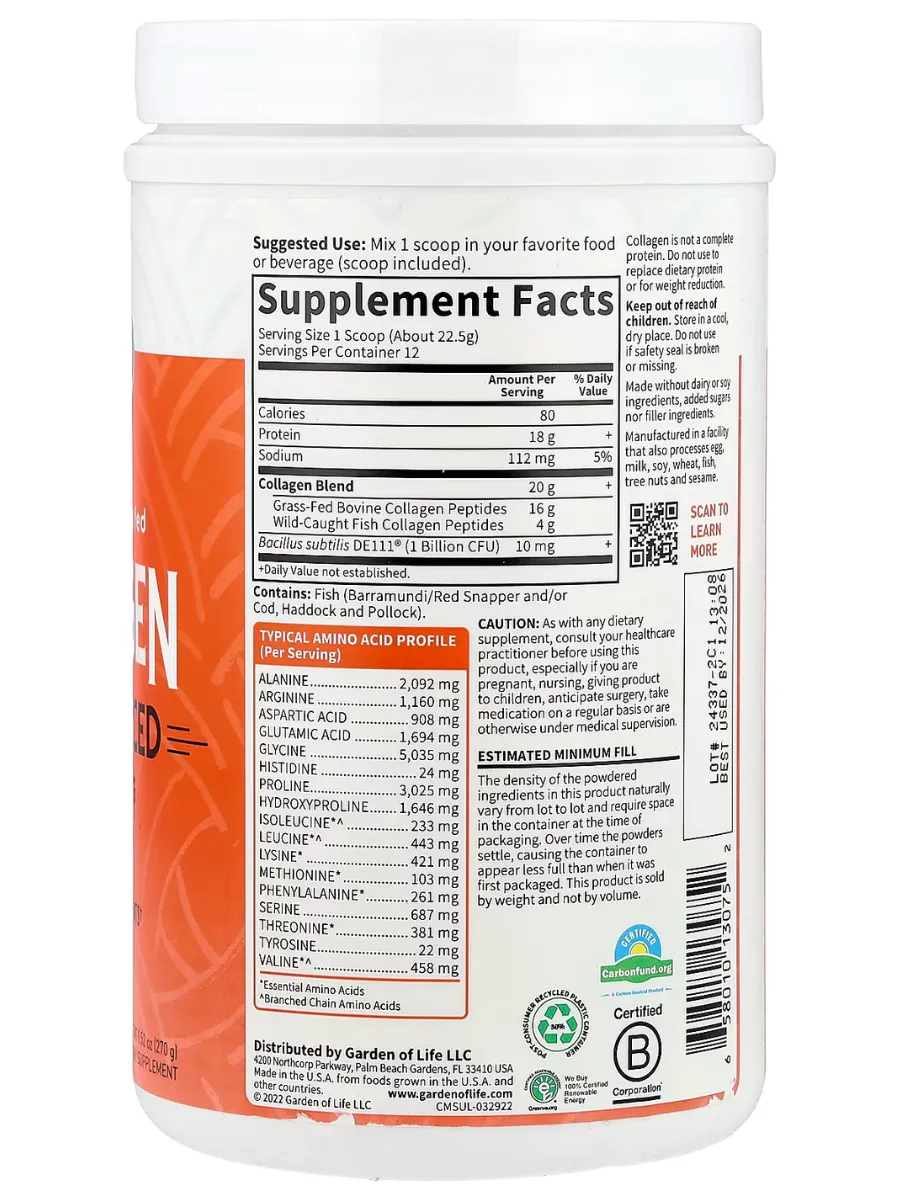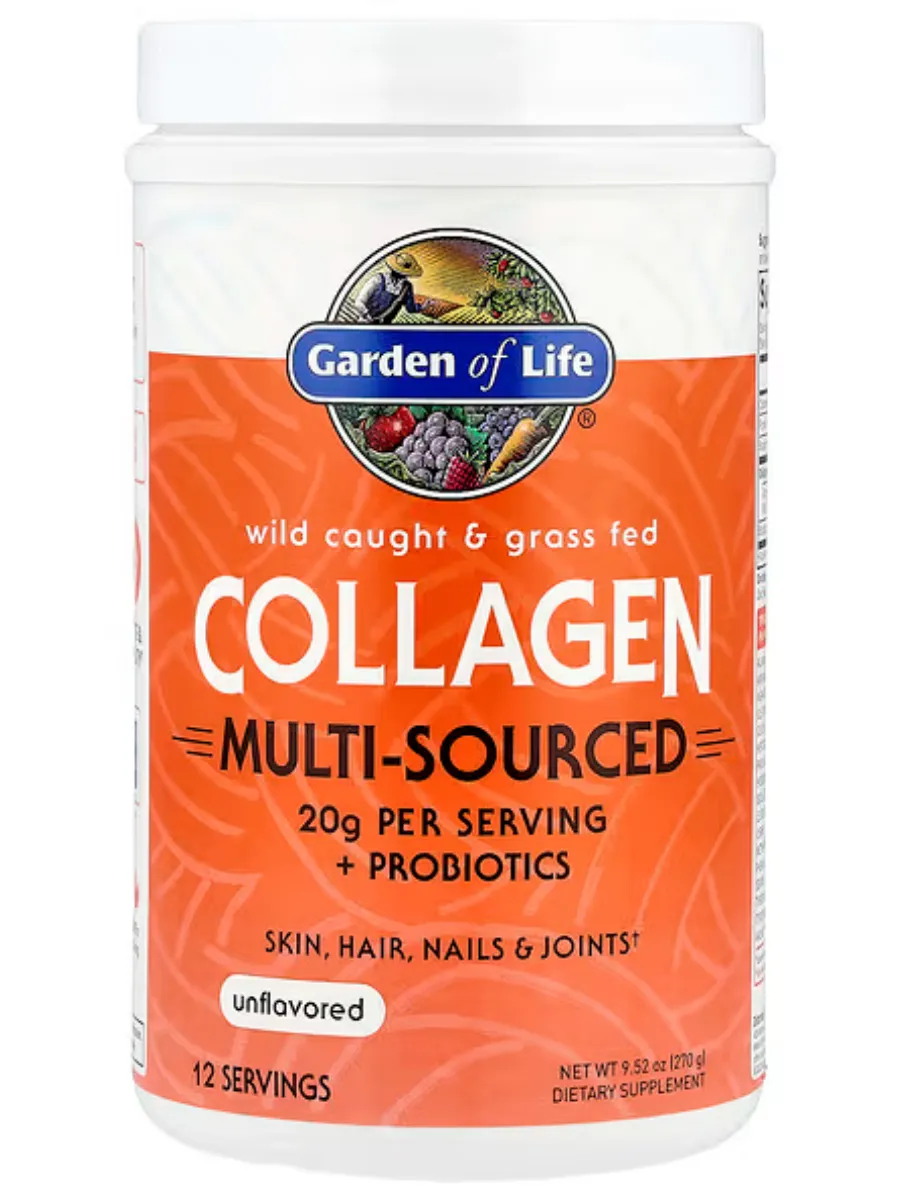 Garden of Life Wild Caught & Grass Fed Collagen, Multi-Sourced, Unflavored — это коллагеновый комплекс из нескольких источников для поддержки здоровья кожи, волос, ногтей и суставов. Каждая порция (1 мерная ложка, около 20 г) содержит 20 г коллагеновых пептидов, включая 16 г коллагена типа I и III из травяного откорма крупного рогатого скота и 4 г из дикого улова морской рыбы (барамунди/красный окунь и/или треска, пикша, сайда). Продукт обогащён 1 миллиардом КОЕ пробиотиков Bacillus subtilis DE111 для поддержки пищеварения. Коллаген не имеет вкуса и запаха, легко смешивается с любыми напитками или блюдами и не содержит добавок. Не содержит ГМО, глютен, молочные продукты, искусственные ароматизаторы, красители или консерванты, сертифицирован по стандартам Non-GMO Tested, Keto Certified, Certified Paleo Friendly и NSF Certified Gluten-Free.
