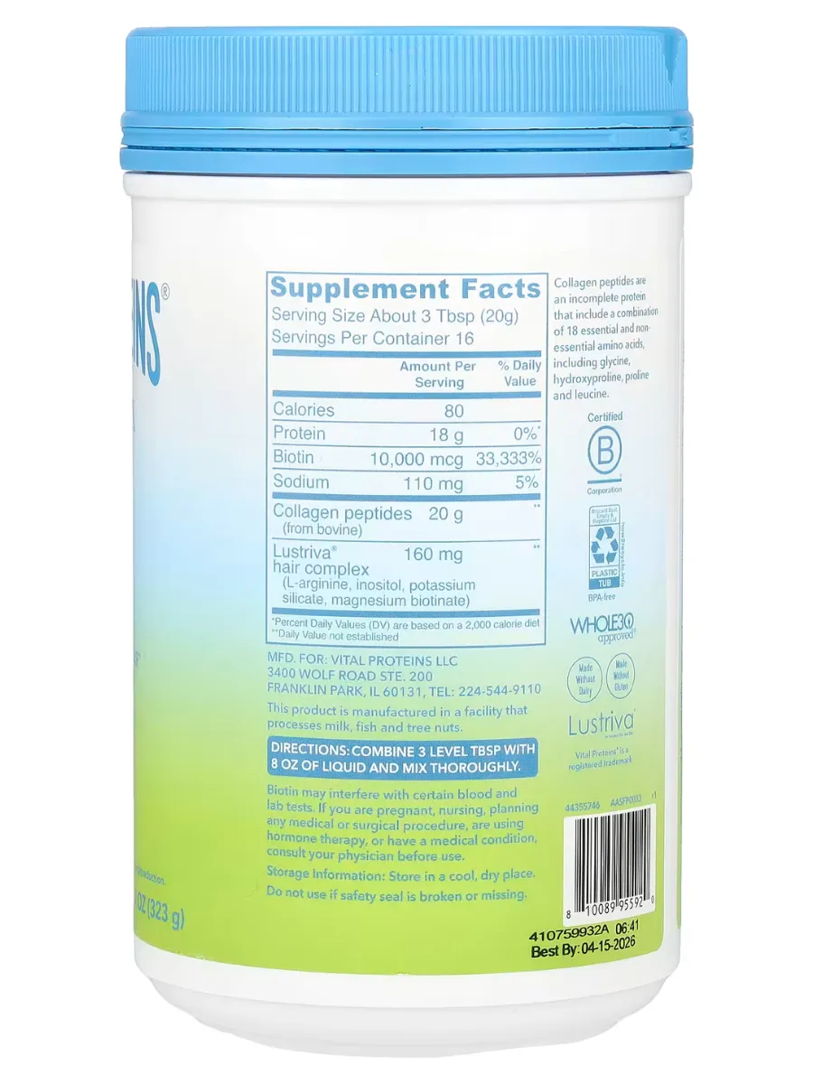 Vital Proteins Hair Complex — это специализированная пищевая добавка, разработанная для поддержки здоровья и роста волос. Формула сочетает гидролизованные коллагеновые пептиды с биотином и комплексом Lustriva, способствуя улучшению структуры волос, их густоты и общего состояния.