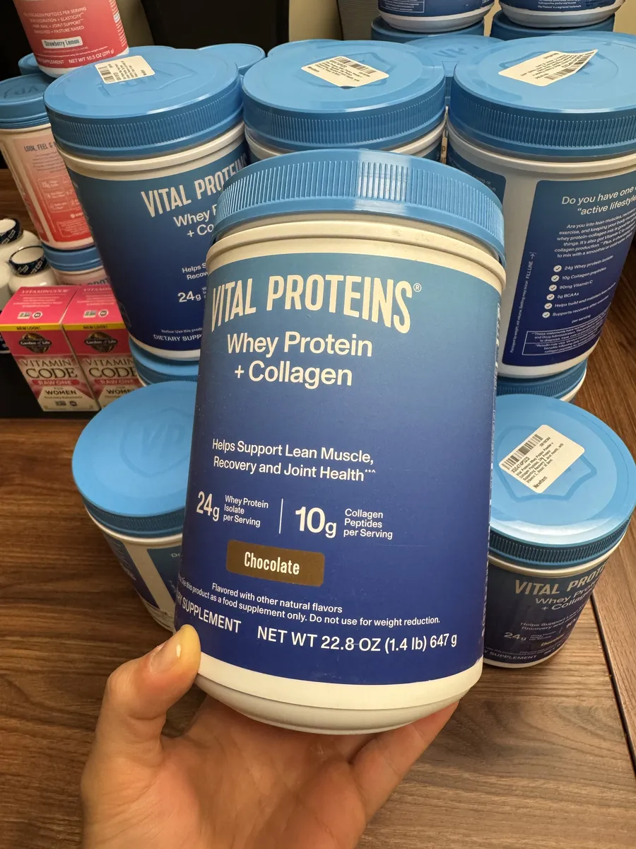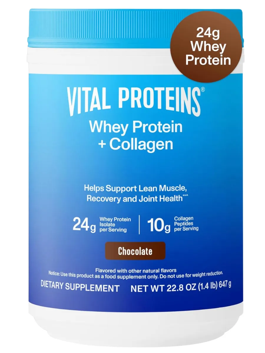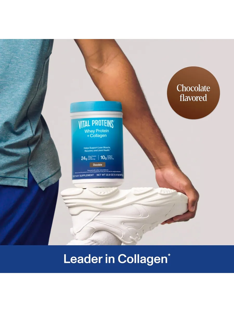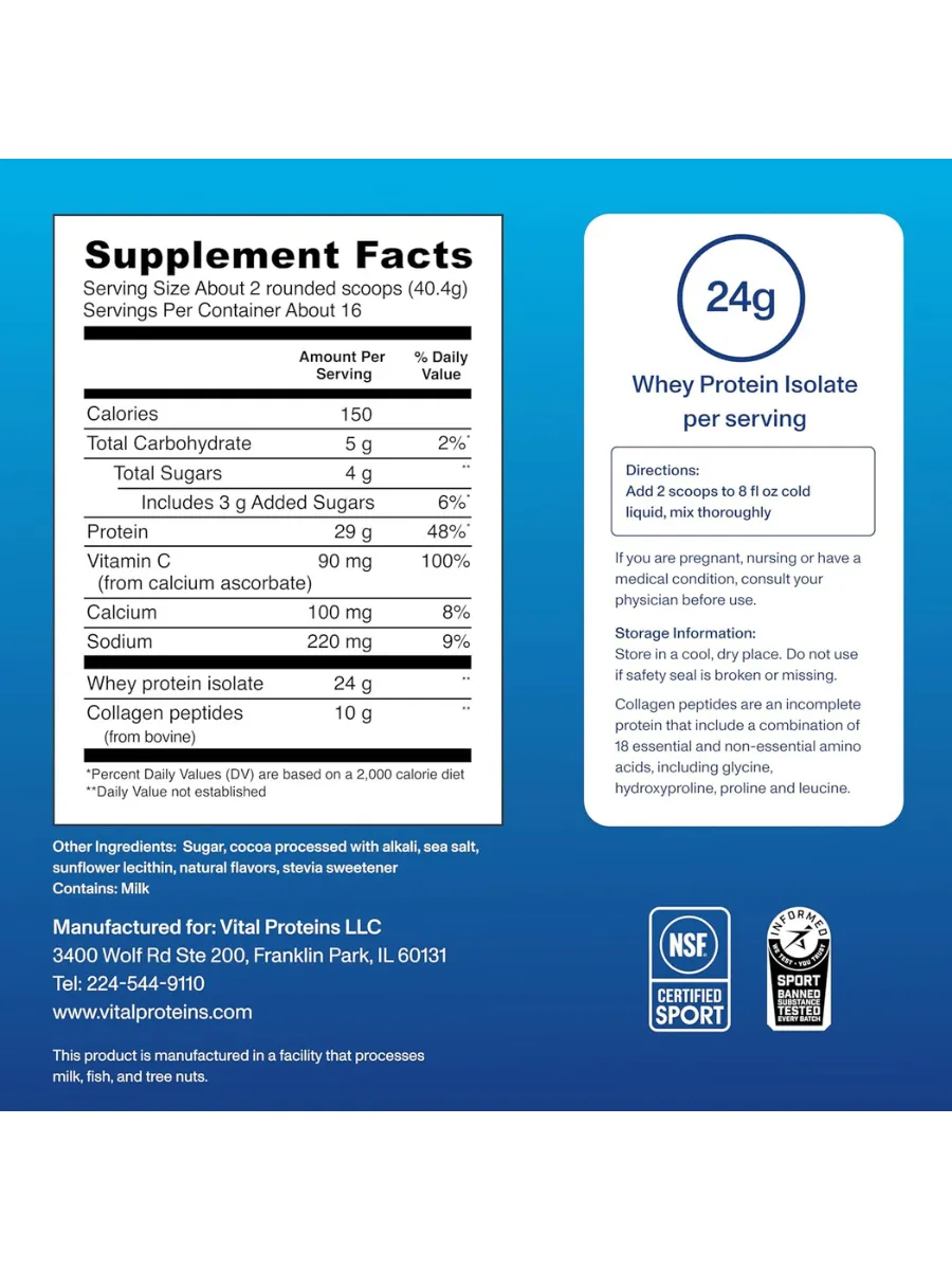 Vital Proteins Whey Protein + Collagen Peptides — это белковый комплекс для поддержки мышечной массы, восстановления и здоровья суставов. Каждая порция (28 г) содержит 24 г сывороточного протеина изолята и 10 г коллагеновых пептидов из шкур крупного рогатого скота, выращенного на пастбищах, а также витамин C для антиоксидантной защиты. Продукт имеет шоколадный вкус с натуральными добавками и разработан для улучшения восстановления после тренировок. Не содержит ГМО, глютен, искусственные ароматизаторы или консерванты, сертифицирован по стандартам GMP.