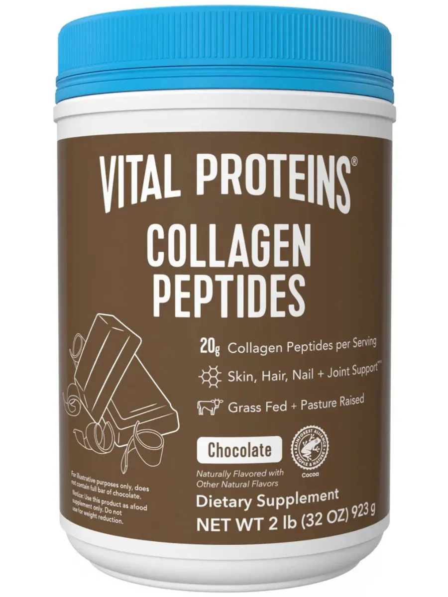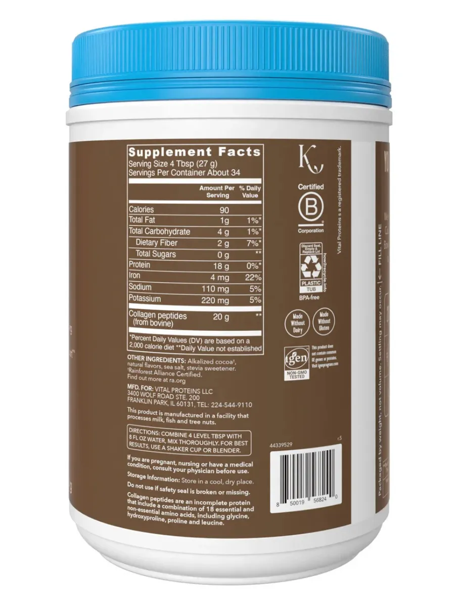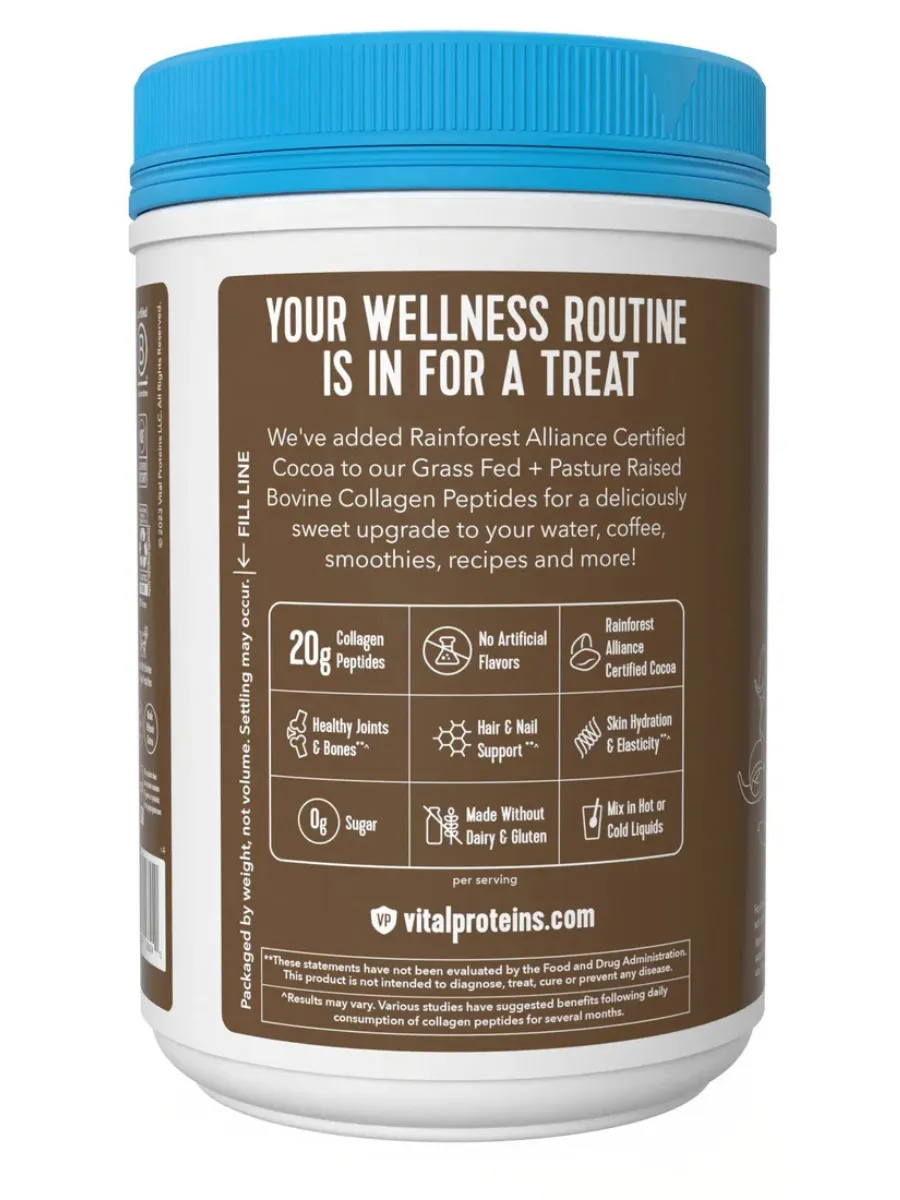 Vital Proteins Пептиды Коллагена с Шоколадным Вкусом — это гидролизованный коллаген высокого качества, обогащенный натуральным какао и полезными нутриентами. Продукт способствует поддержке здоровья кожи, суставов, волос, ногтей и костей, а также обладает приятным шоколадным вкусом, идеально подходящим для добавления в напитки и рецепты.