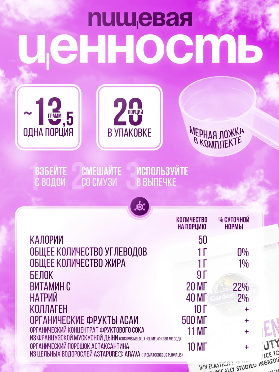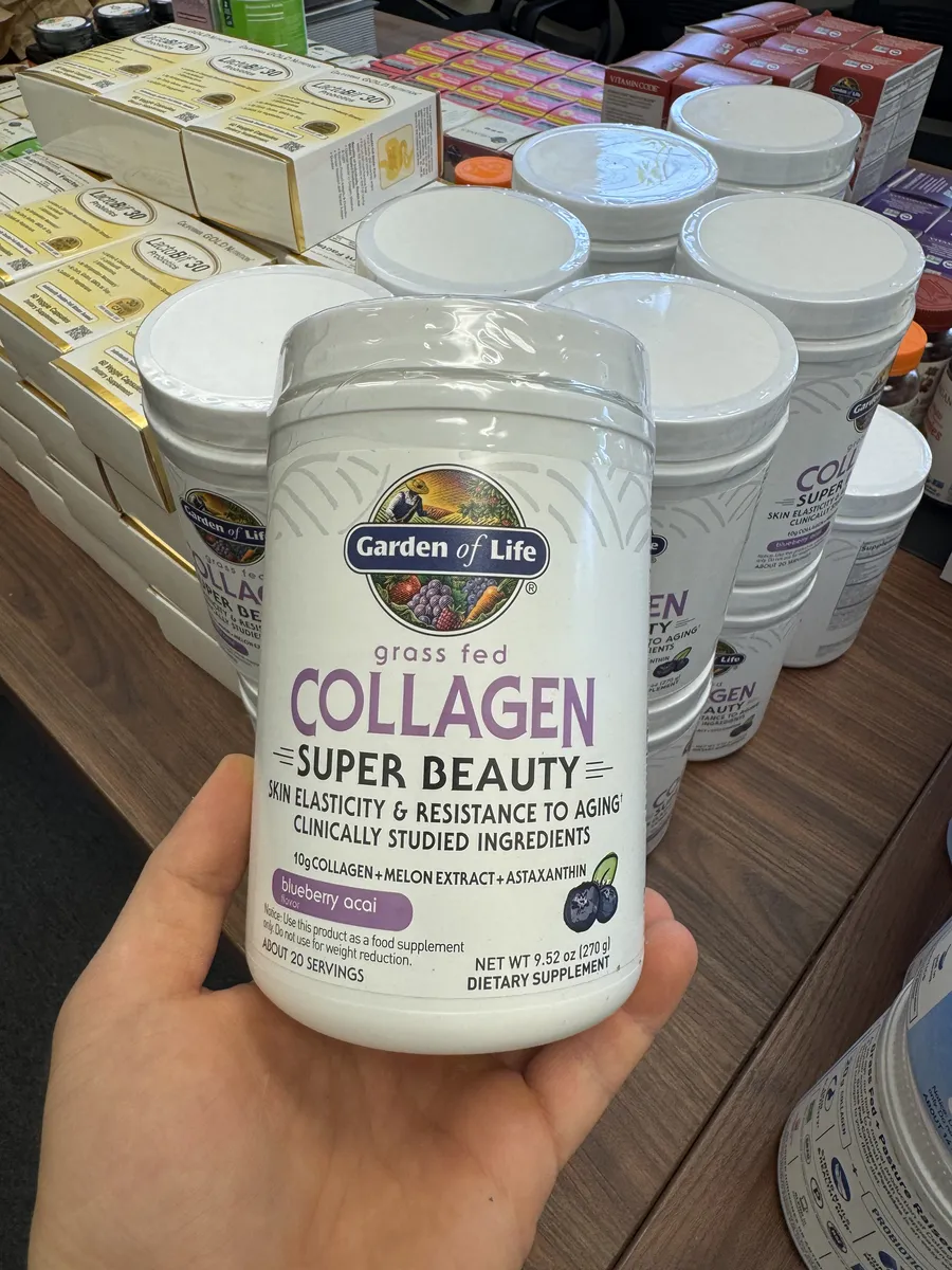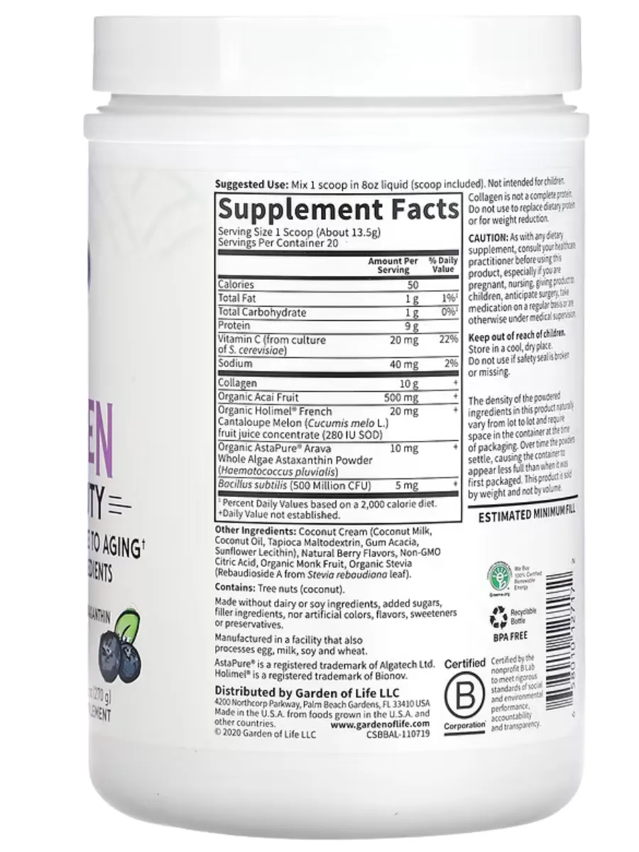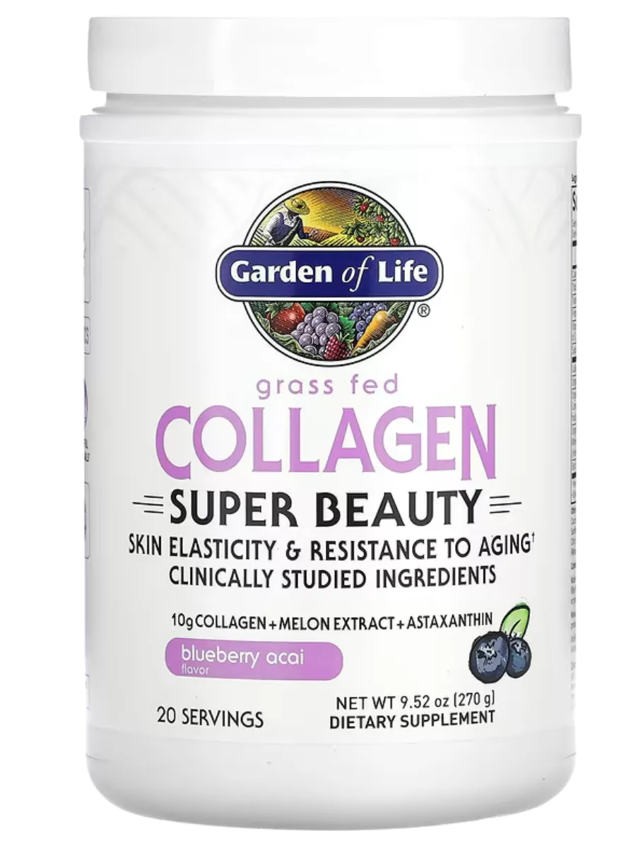 Garden of Life Collagen Super Beauty — премиальный коллагеновый порошок для поддержки здоровья кожи, волос и ногтей. Содержит 10 г легкоусвояемых пептидов коллагена типов I и III от коров травяного откорма. Формула обогащена экстрактом французской дыни Holimel, органическим астаксантином AstaPure и витамином C для повышения эластичности кожи и защиты от окислительного стресса. Дополнительно содержит 500 млн КОЕ пробиотиков для поддержки пищеварения. Приятный вкус черники и асаи.