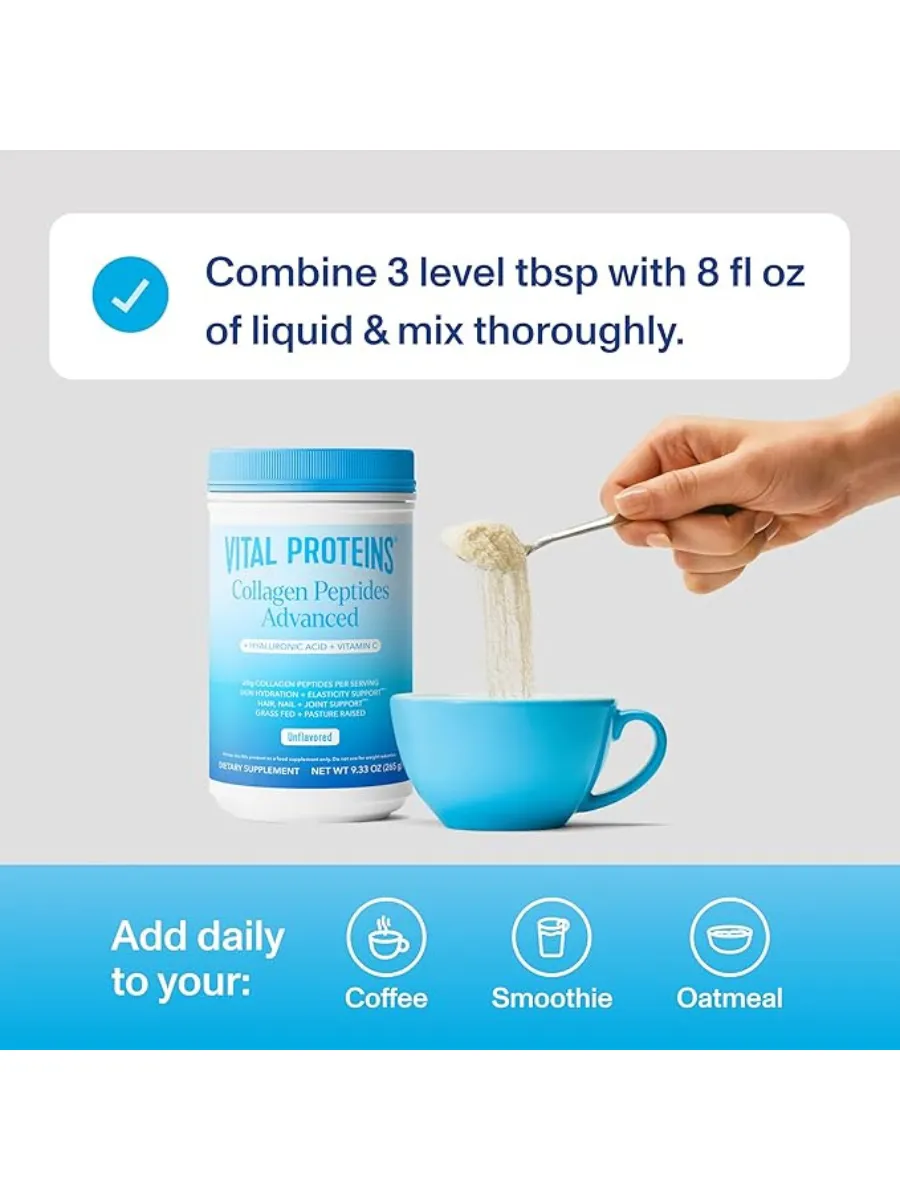 Vital Proteins, Collagen Peptides Powder Advanced, гидролизованный коллаген с гиалуроновой кислотой и витамином C, 265 г (13 порций), без вкуса