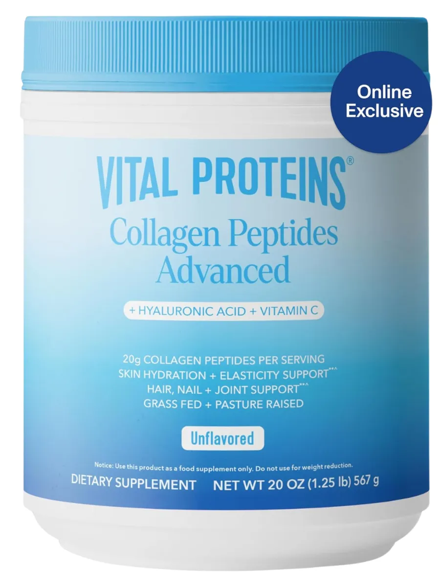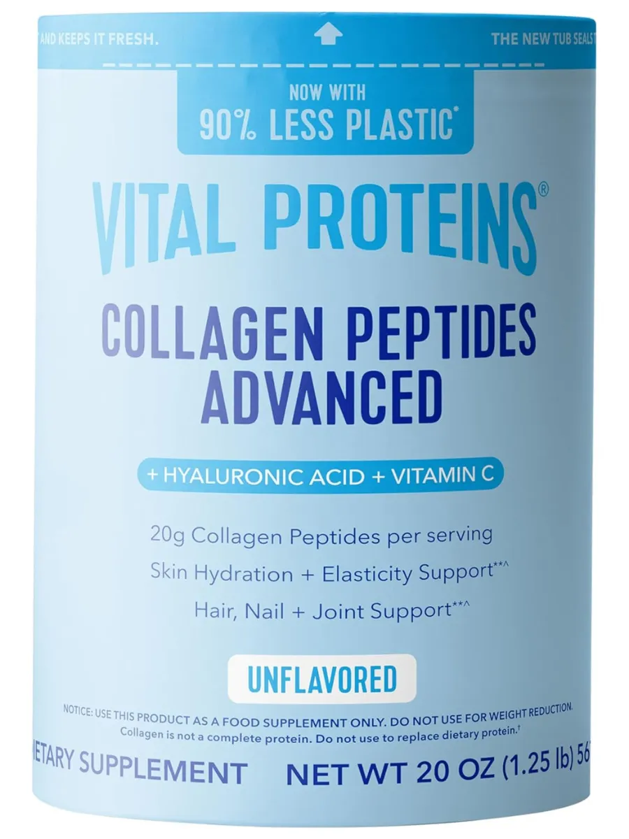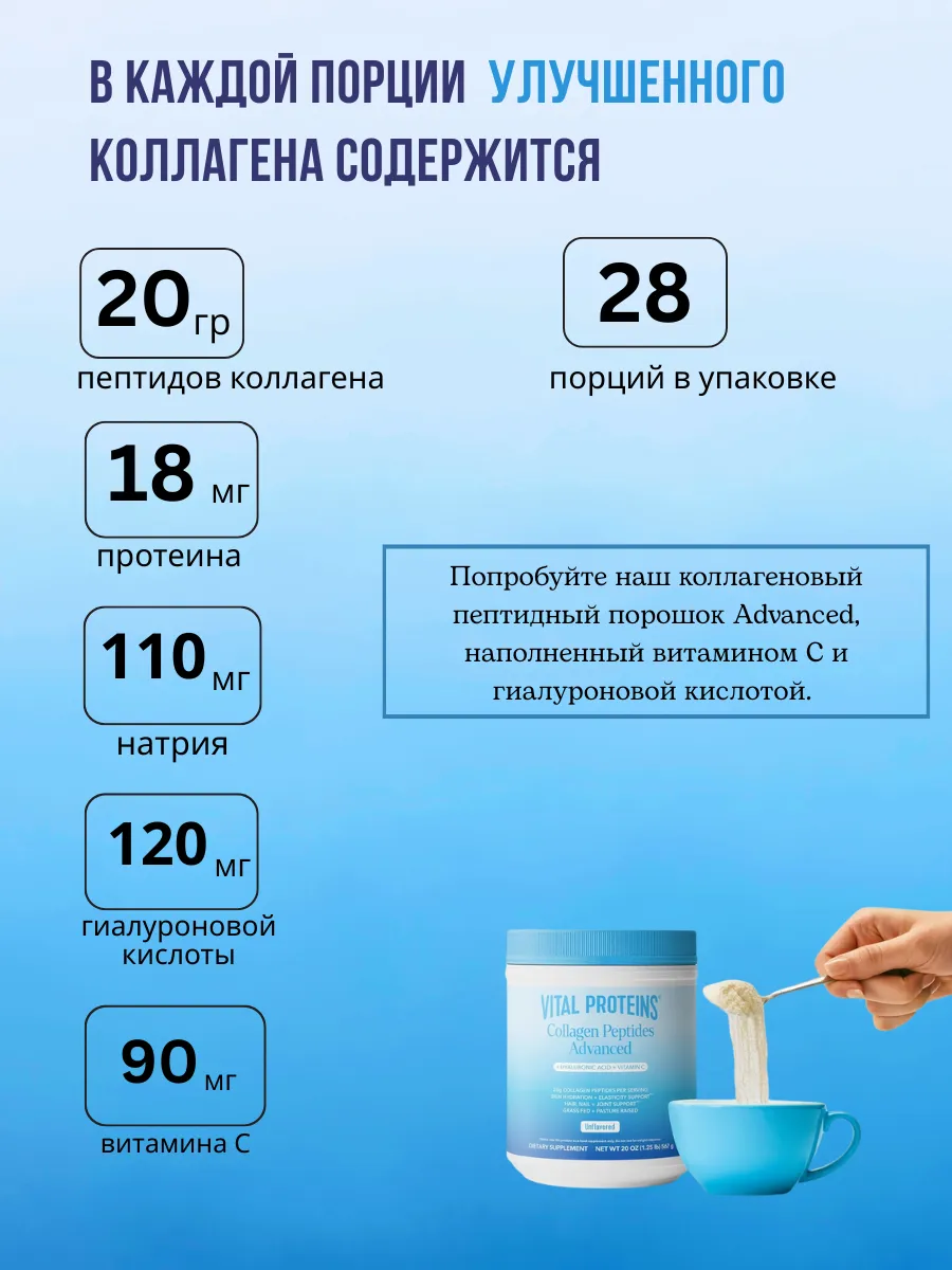 Vital Proteins Collagen Peptides Powder Advanced with Hyaluronic Acid & Vitamin C — это коллагеновый комплекс в порошковой форме для поддержки здоровья кожи, волос, ногтей и суставов. Каждая порция (27 г, примерно 2 столовые ложки) содержит 20 г гидролизованных коллагеновых пептидов из шкур крупного рогатого скота, выращенного на пастбищах, 120 мг гиалуроновой кислоты для увлажнения кожи и 45 мг витамина C для антиоксидантной защиты и синтеза коллагена. Продукт не имеет вкуса, легко растворяется в горячих или холодных напитках и разработан для улучшения эластичности и восстановления. Не содержит ГМО, глютен, молочные продукты, искусственные ароматизаторы или консерванты, подходит для палео- и кето-диет и сертифицирован по стандартам GMP.