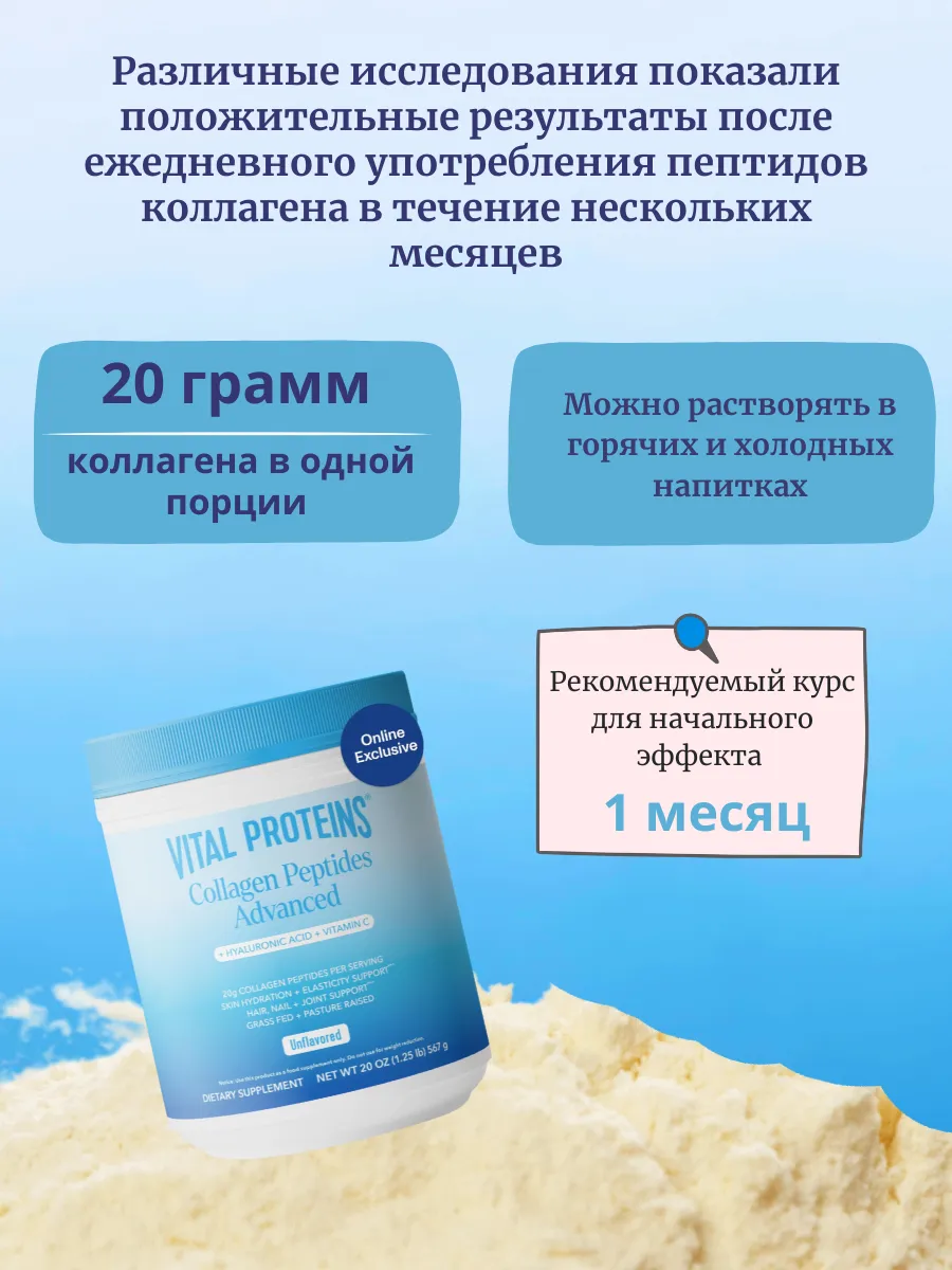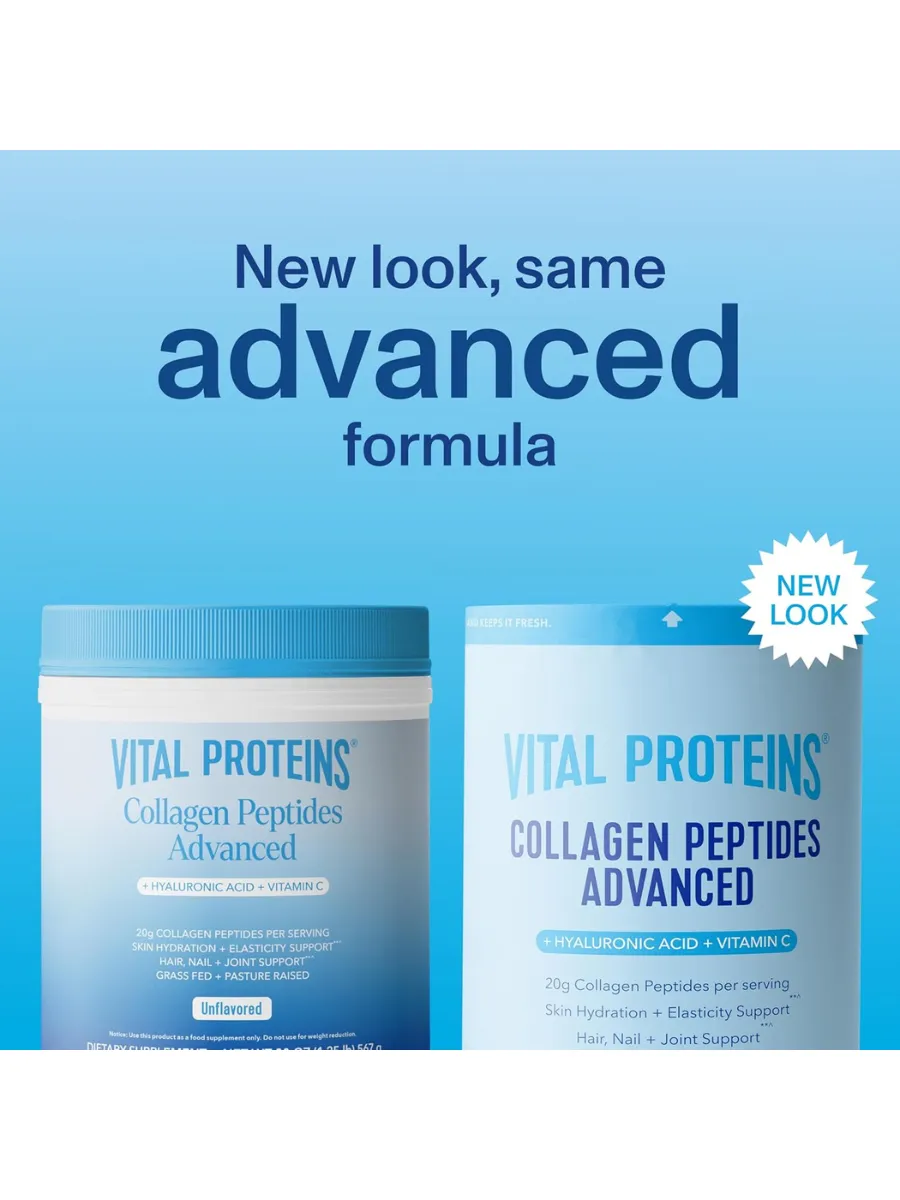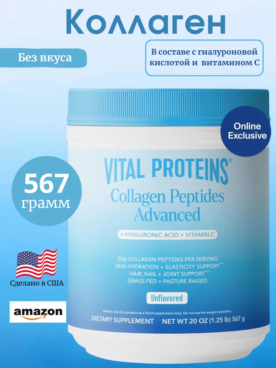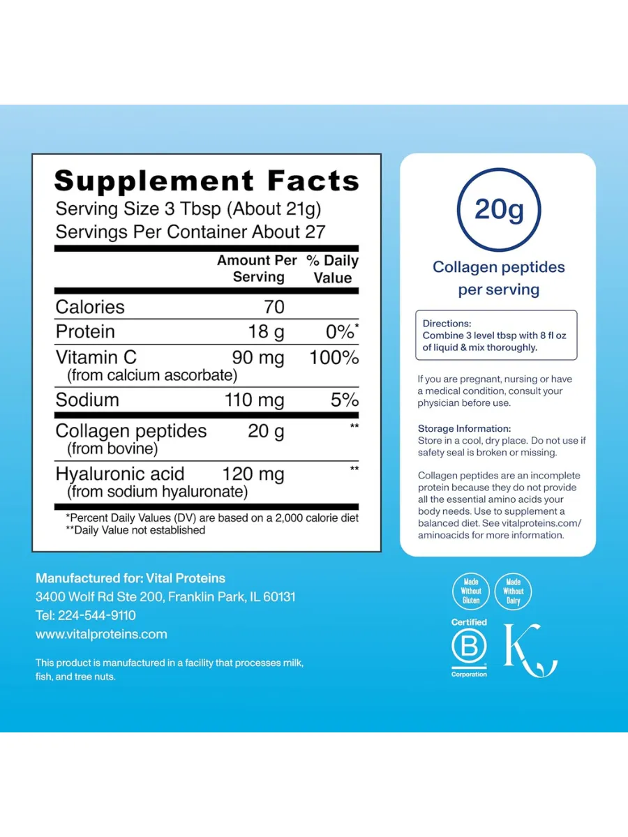 Vital Proteins Collagen Peptides Powder Advanced with Hyaluronic Acid & Vitamin C — это коллагеновый комплекс в порошковой форме для поддержки здоровья кожи, волос, ногтей и суставов. Каждая порция (27 г, примерно 2 столовые ложки) содержит 20 г гидролизованных коллагеновых пептидов из шкур крупного рогатого скота, выращенного на пастбищах, 120 мг гиалуроновой кислоты для увлажнения кожи и 45 мг витамина C для антиоксидантной защиты и синтеза коллагена. Продукт не имеет вкуса, легко растворяется в горячих или холодных напитках и разработан для улучшения эластичности и восстановления. Не содержит ГМО, глютен, молочные продукты, искусственные ароматизаторы или консерванты, подходит для палео- и кето-диет и сертифицирован по стандартам GMP.