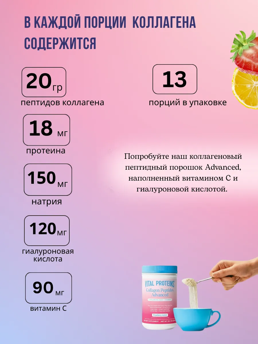 Улучшенная формула Collagen Peptides Advanced теперь и во вкусном клубнично-лимонном варианте. Продукт сочетает в себе 20 г гидролизованного коллагена, гиалуроновую кислоту и витамин C для активной поддержки кожи, суставов, волос и ногтей.