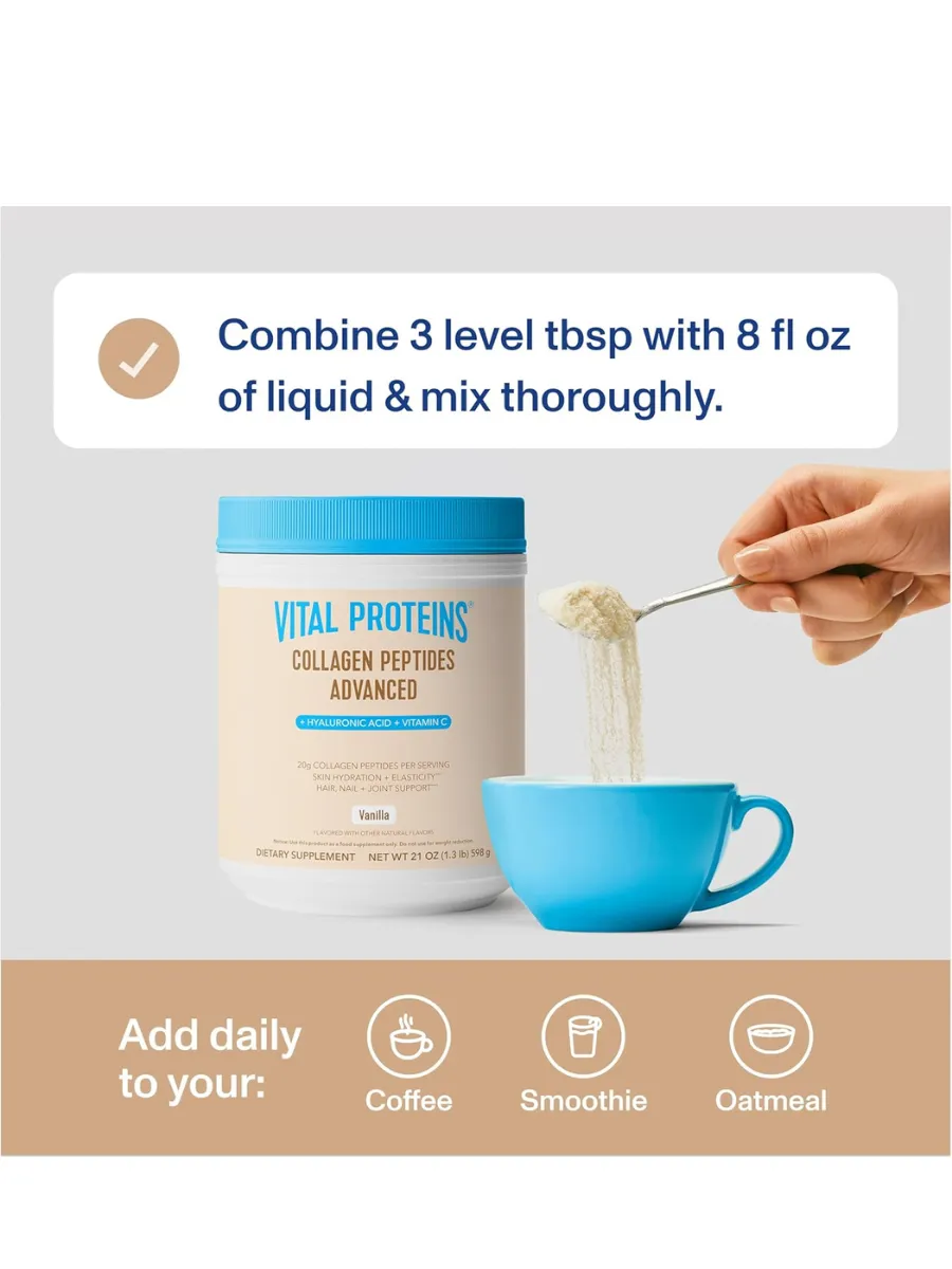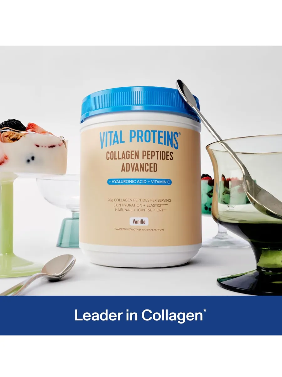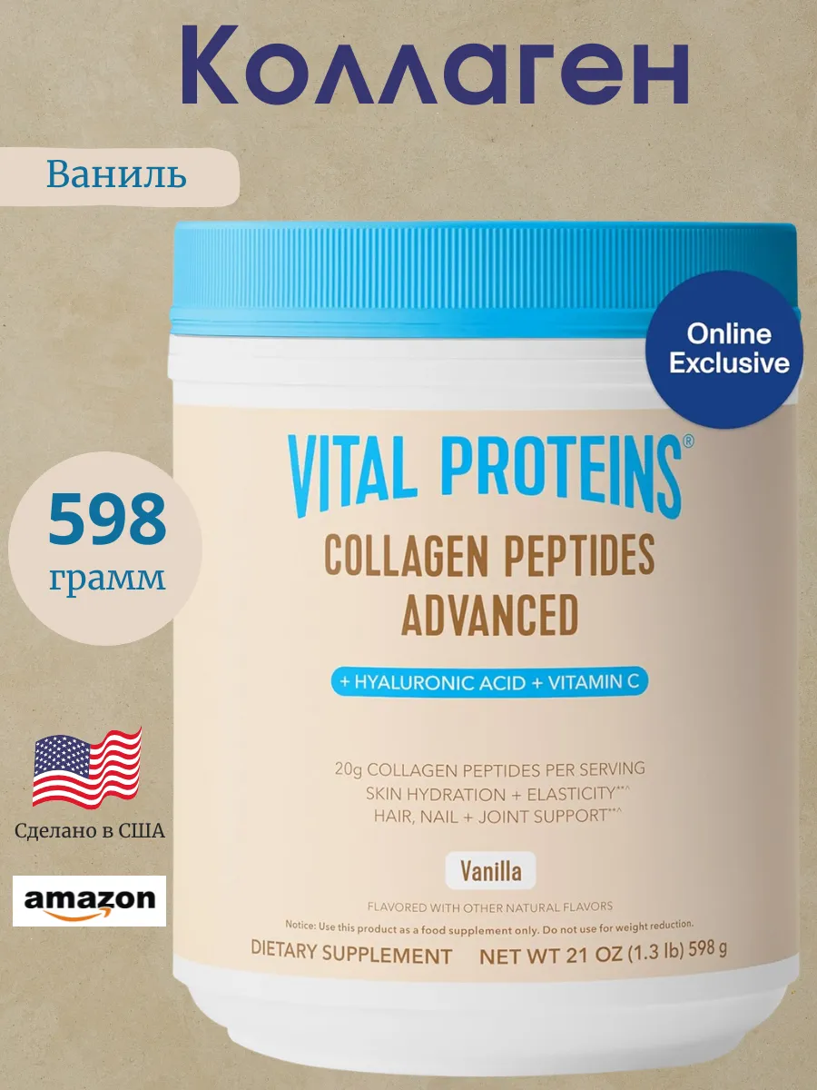 Vital Proteins Collagen Peptides Advanced, Hydrolyzed Peptides with Hyaluronic Acid and Vitamin C - Vanilla Flavor Powder — это коллагеновый комплекс в порошковой форме для поддержки здоровья кожи, волос, ногтей и суставов. Каждая порция (27 г, примерно 2 столовые ложки) содержит 20 г гидролизованных коллагеновых пептидов из шкур крупного рогатого скота, выращенного на пастбищах, 120 мг гиалуроновой кислоты для увлажнения кожи и 45 мг витамина C для антиоксидантной защиты и синтеза коллагена. Продукт имеет натуральный ванильный вкус, легко растворяется в горячих или холодных напитках и разработан для улучшения эластичности и восстановления. Не содержит ГМО, глютен, молочные продукты, искусственные ароматизаторы или консерванты, подходит для палео- и кето-диет и сертифицирован по стандартам GMP.