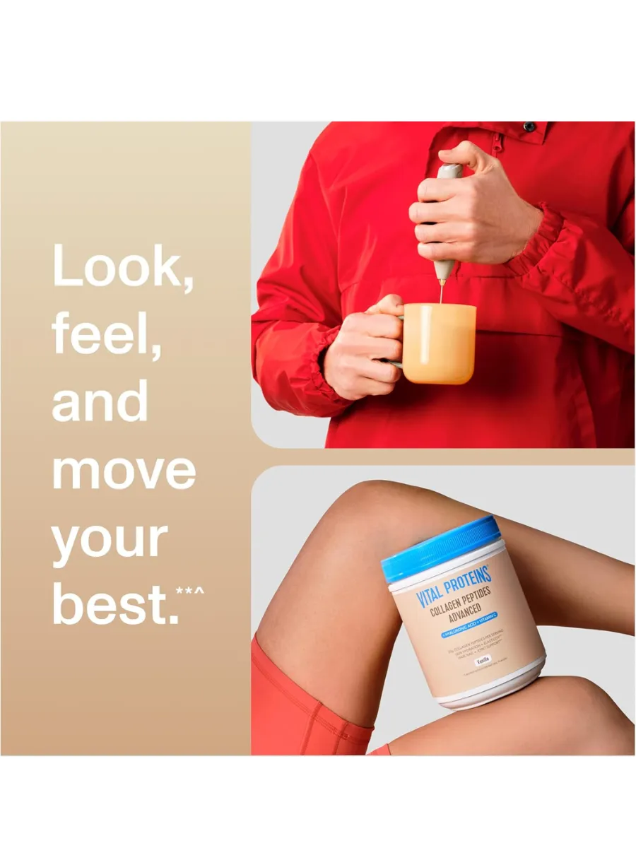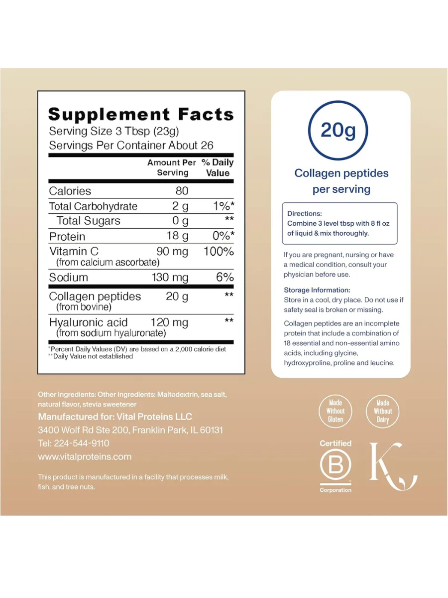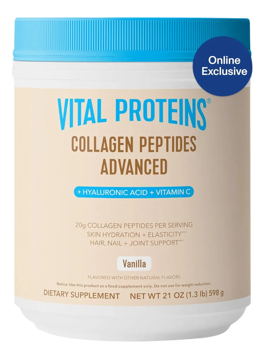 Vital Proteins Collagen Peptides Advanced, Hydrolyzed Peptides with Hyaluronic Acid and Vitamin C - Vanilla Flavor Powder — это коллагеновый комплекс в порошковой форме для поддержки здоровья кожи, волос, ногтей и суставов. Каждая порция (27 г, примерно 2 столовые ложки) содержит 20 г гидролизованных коллагеновых пептидов из шкур крупного рогатого скота, выращенного на пастбищах, 120 мг гиалуроновой кислоты для увлажнения кожи и 45 мг витамина C для антиоксидантной защиты и синтеза коллагена. Продукт имеет натуральный ванильный вкус, легко растворяется в горячих или холодных напитках и разработан для улучшения эластичности и восстановления. Не содержит ГМО, глютен, молочные продукты, искусственные ароматизаторы или консерванты, подходит для палео- и кето-диет и сертифицирован по стандартам GMP.