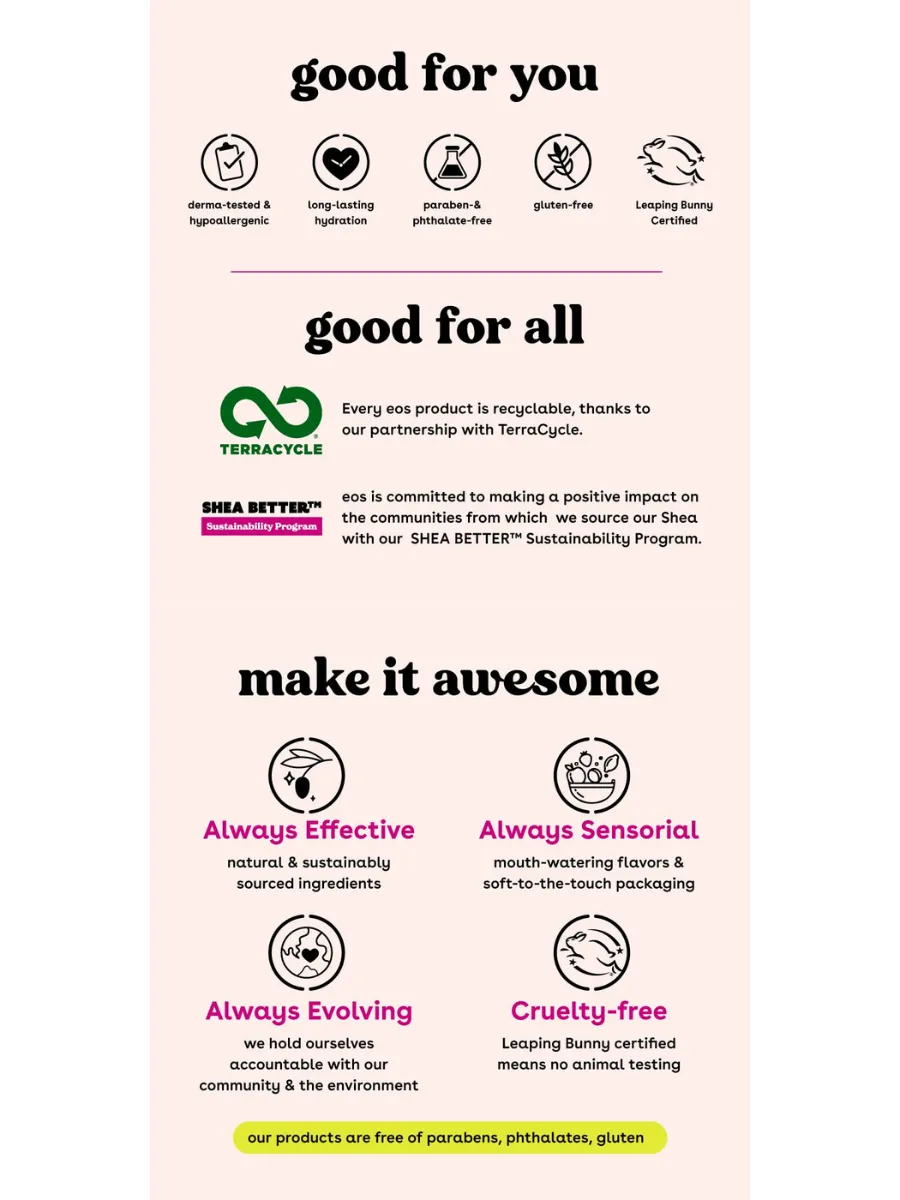 eos (Evolution of Smooth) — популярный американский бренд средств по уходу за кожей, известный своими качественными и эффективными формулами. Продукция eos производится в США и разрабатывается с акцентом на использование питательных компонентов, таких как масло ши и натуральные увлажняющие ингредиенты. Бренд ценится за высокое качество, приятные текстуры, комфорт в использовании и современный подход к уходу за кожей.