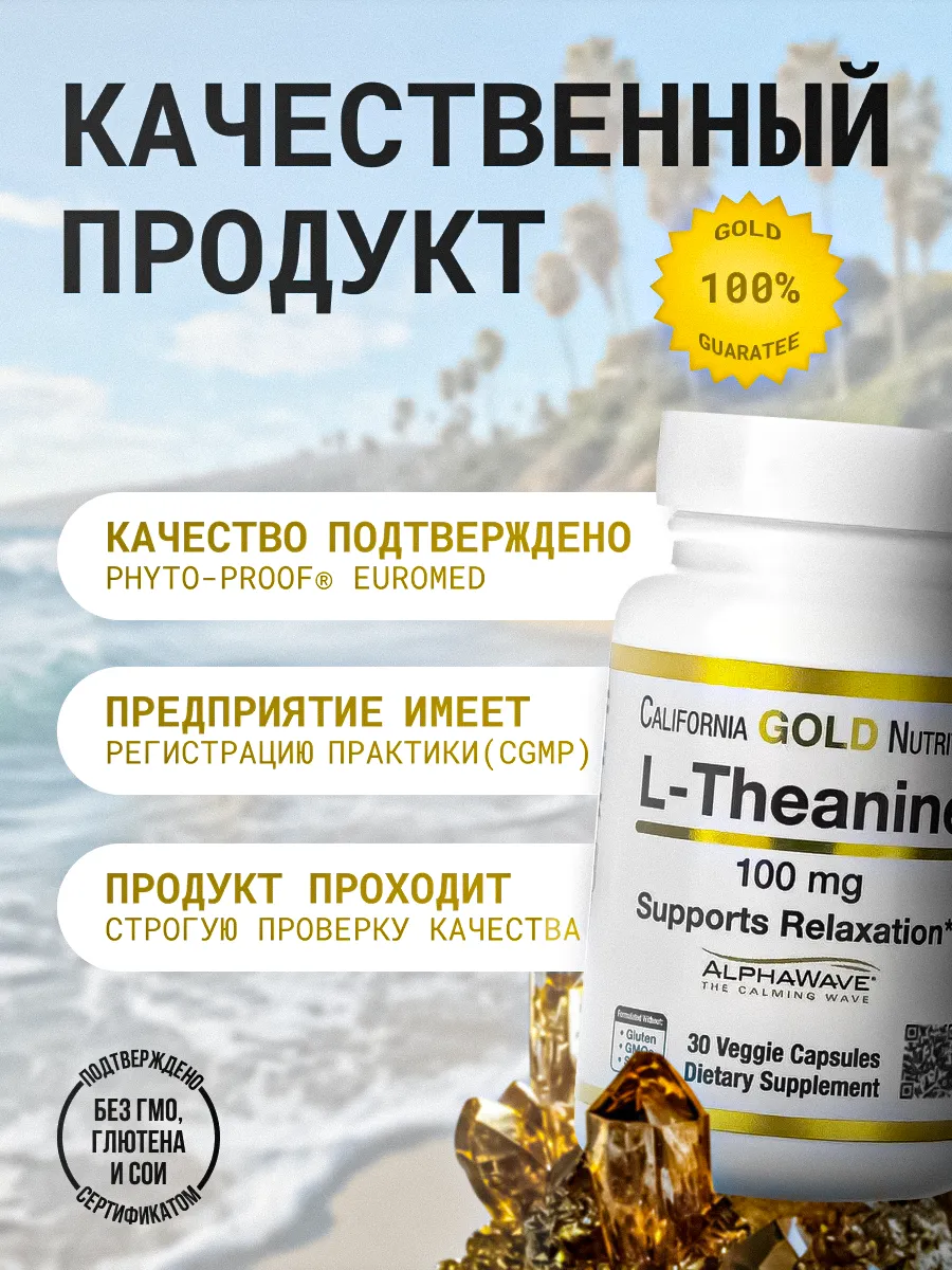 California Gold Nutrition L-теанин с AlphaWave — это натуральная аминокислота, полученная из зеленого чая, которая способствует расслаблению, улучшению концентрации и снижению стресса без ощущения сонливости. AlphaWave — это запатентованная форма L-теанина, обеспечивающая высокую эффективность и биодоступность.