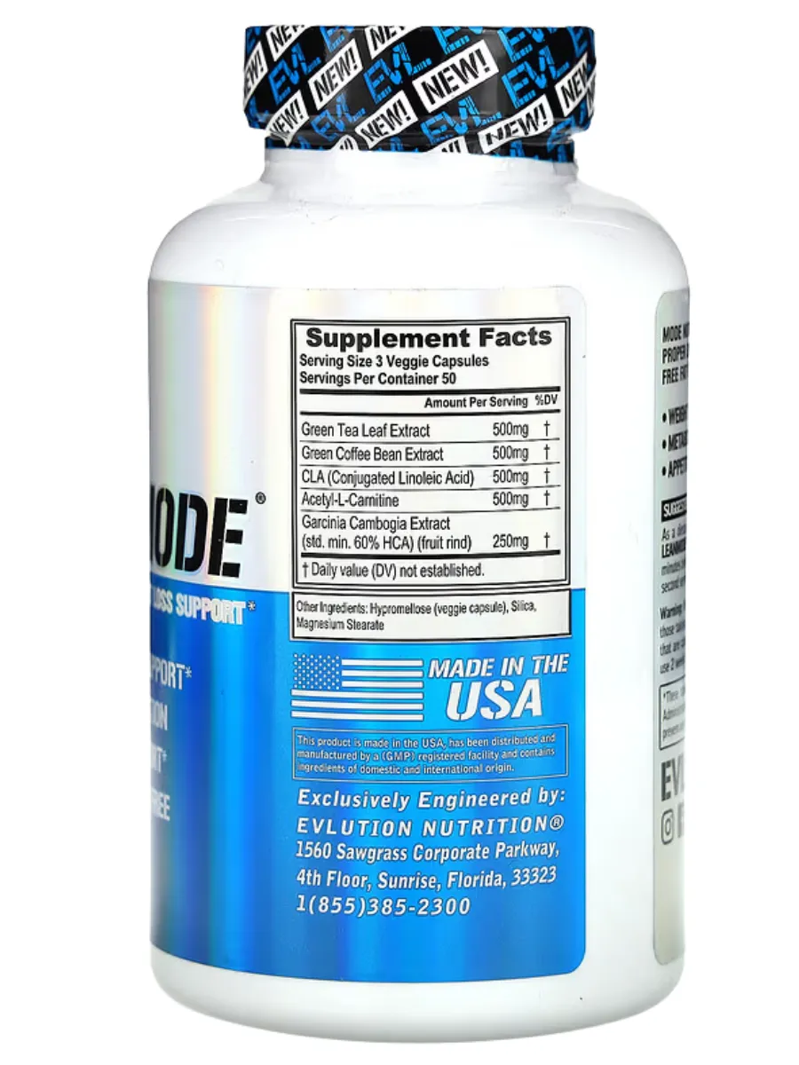 EVLution Nutrition LeanMode — это добавка для поддержки снижения веса без стимуляторов, разработанная для сжигания жира и контроля аппетита. Каждая порция (3 капсулы) содержит 5 активных ингредиентов, включая 1,5 г ацетил-L-карнитина, 1 г CLA (конъюгированной линолевой кислоты), 500 мг экстракта зелёного кофе и 200 мг экстракта гарцинии камбоджийской, которые способствуют ускорению метаболизма, сжиганию жира и снижению тяги к пище. Продукт разработан для достижения целей по снижению веса при правильном питании и тренировках. Не содержит ГМО, глютен, стимуляторы, искусственные красители или консерванты, подходит для веганов и сертифицирован по стандартам GMP и Halal.