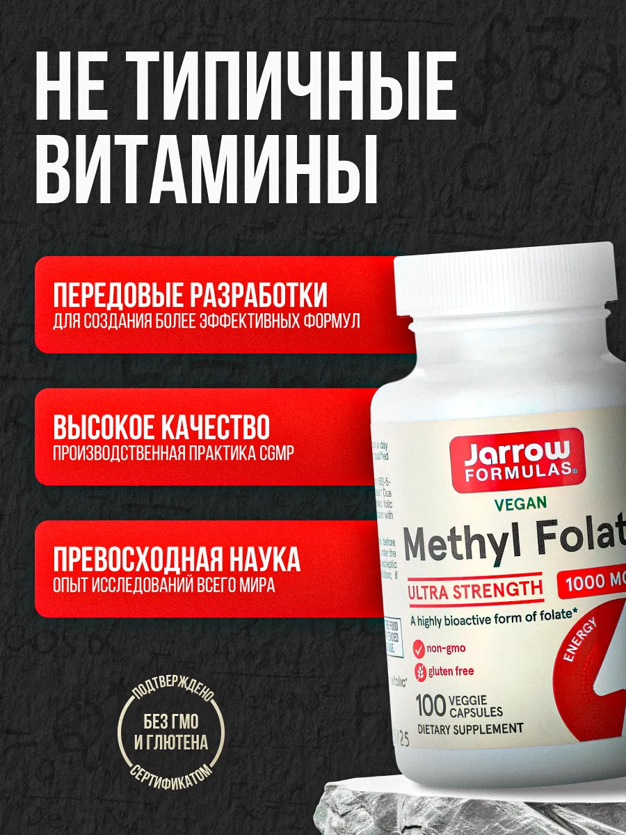 Высокая биодоступность: Метилфолат (5-MTHF) — это активная форма фолиевой кислоты, которая легко усваивается организмом, в отличие от синтетической формы.