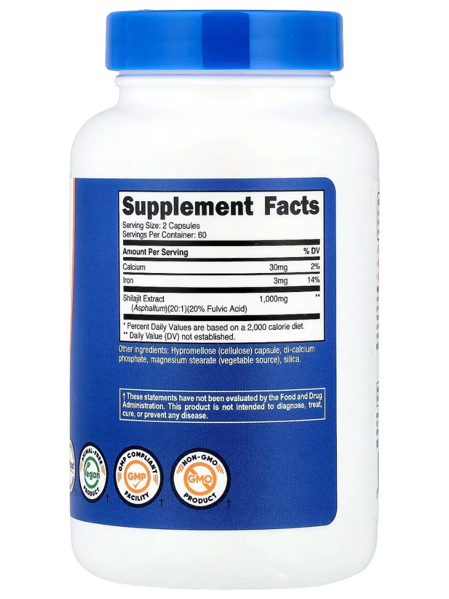 Nutricost Shilajit — это чистый гималайский мумиё в капсулах с натуральным содержанием фульвовой кислоты для поддержки энергии, иммунитета и общего здоровья. Каждая порция (2 капсулы) содержит 1000 мг мумиё (Shilajit Extract), богатого фульвовой кислотой и более чем 80 микроэлементами в биоактивной форме. Продукт добывается из высокогорных регионов Гималаев и помогает повысить уровень энергии, улучшить усвоение питательных веществ, поддержать тестостерон и восстановление после нагрузок. Не содержит ГМО, глютен, искусственные красители или консерванты, произведён в сертифицированном GMP-объекте с независимым третьесторонним тестированием.