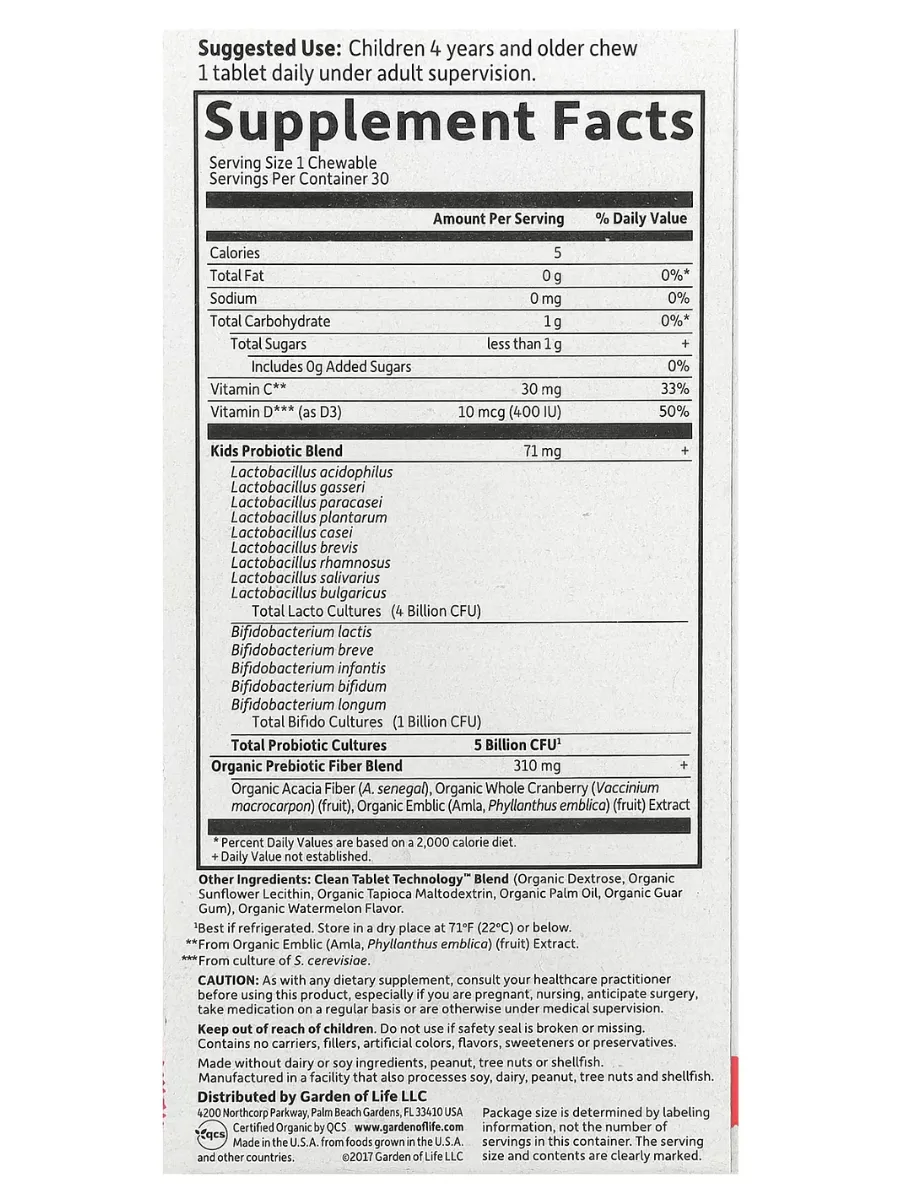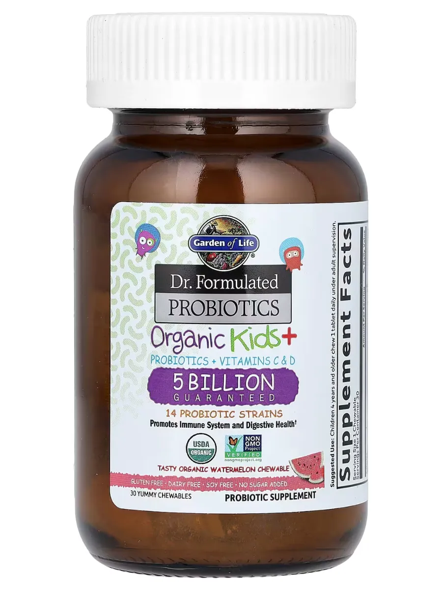 Garden of Life Dr. Formulated Organic Kids+ Probiotics + Vitamins C & D (арбуз) — это органические жевательные таблетки для детей с пробиотиками и витаминами для поддержки иммунитета и пищеварения. Каждая порция (1 жевательная таблетка) содержит 5 миллиардов КОЕ из 14 штаммов пробиотиков (включая Lactobacillus и Bifidobacterium), 30 мг витамина C и 10 мкг (400 МЕ) витамина D3 из органических источников. Продукт имеет натуральный вкус арбуза, без добавления сахара, и разработан для ежедневной поддержки здорового пищеварения, иммунитета и общего благополучия ребёнка. Не содержит ГМО, глютен, молочные продукты, сою, искусственные ароматизаторы или красители, сертифицирован по стандартам USDA Organic, Non-GMO Project Verified и NSF Gluten-Free.