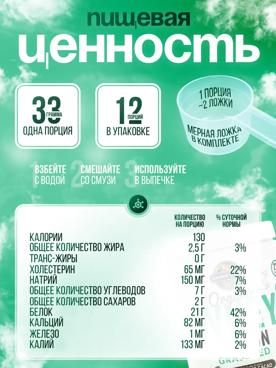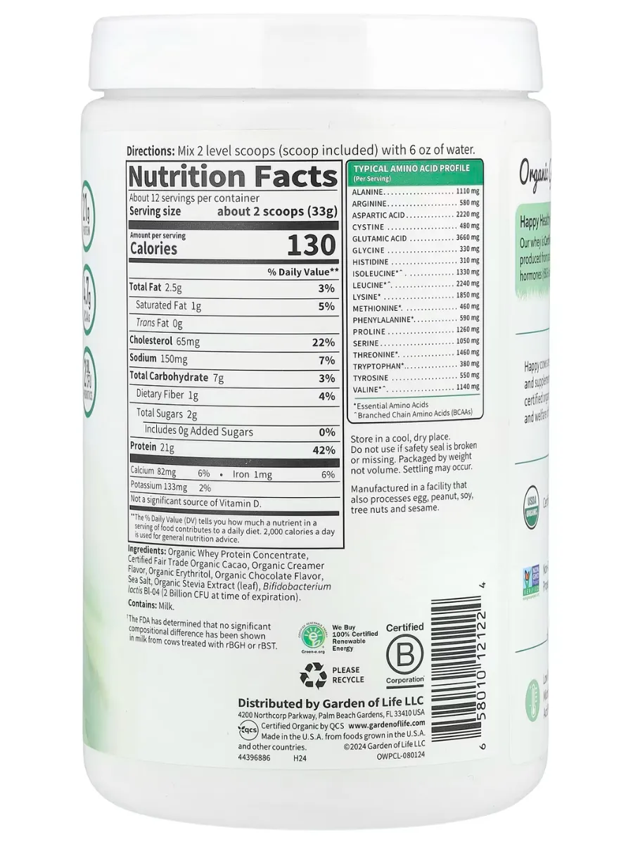 Органический сывороточный протеин Garden of Life производится из молока коров, питающихся исключительно травой и выращенных без гормонов роста и антибиотиков. Продукт обладает натуральным шоколадно-какао вкусом и обогащён пробиотиками для лучшего пищеварения.