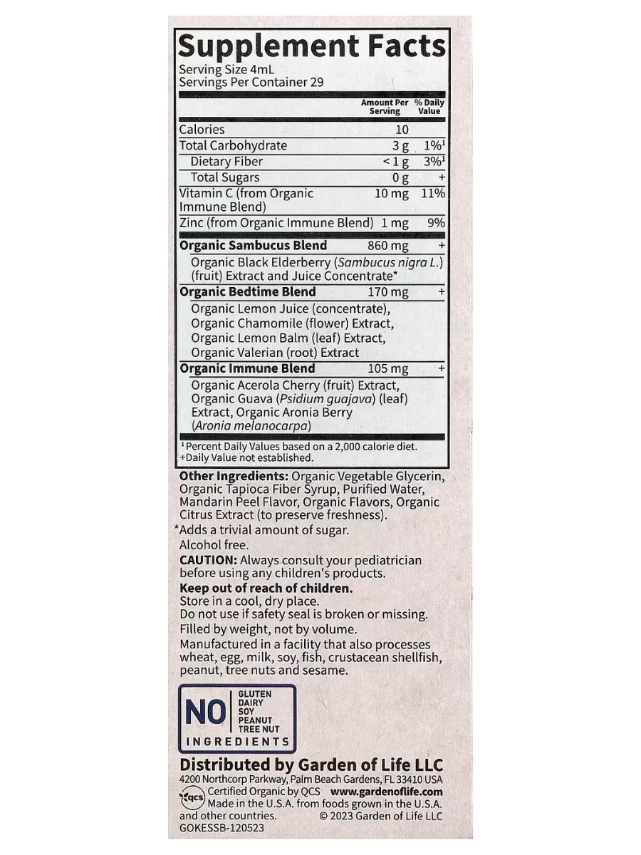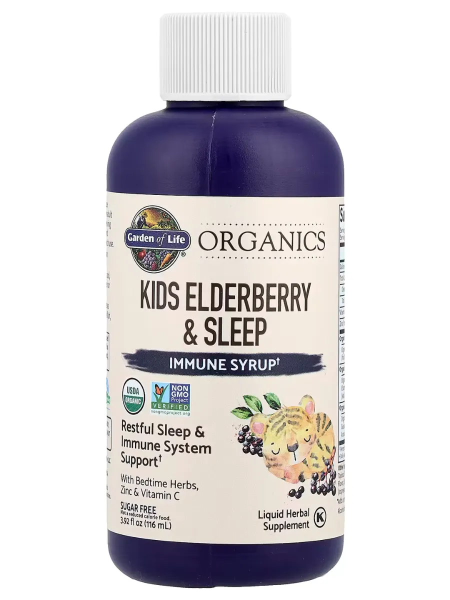 Garden of Life Organics Kids Elderberry & Sleep — это органический сироп для укрепления иммунитета и поддержки здорового сна у детей, созданный из цельных пищевых продуктов. Каждая порция (4 мл) содержит 860 мг органической смеси бузины (Sambucus nigra L., экстракт и сок концентрат), 170 мг органической смеси для сна (лимонный сок, экстракты ромашки, мелиссы и валерианы) и 105 мг органической иммунной смеси (экстракты ацеролы, гуавы и аронии), а также 10 мг витамина C и 1 мг цинка для антиоксидантной защиты и иммунитета. Продукт имеет приятный вкус мандарина, без сахара, алкоголя и искусственных добавок. Не содержит ГМО, глютен, молочные продукты, искусственные ароматизаторы или консерванты, подходит для веганов и сертифицирован по стандартам USDA Organic, Non-GMO Project, NSF Gluten-Free и кошерности.