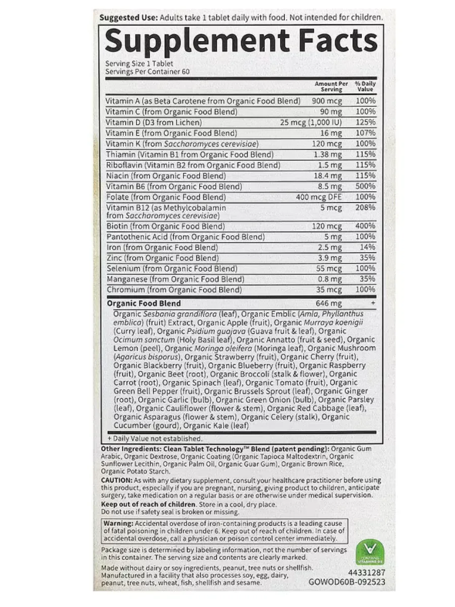 Garden of Life Organics Women's Once Daily — это мультивитаминный комплекс из цельных пищевых продуктов, разработанный специально для поддержки здоровья женщин. Каждая порция (1 таблетка) содержит 15 витаминов и минералов, включая 500% дневной нормы витамина B12 (в форме метилкобаламина) для энергии и метаболизма, а также 2,5 мг железа для здоровья крови. Продукт включает более 30 органических фруктов, овощей и трав, таких как лимон, базилик и амла, для антиоксидантной поддержки и здоровья кожи и ногтей. Не содержит ГМО, глютен, сою, молочные продукты, искусственные красители, наполнители или консерванты, подходит для веганов и сертифицирован по стандартам USDA Organic, Non-GMO Project, NSF Gluten-Free и кошерности.