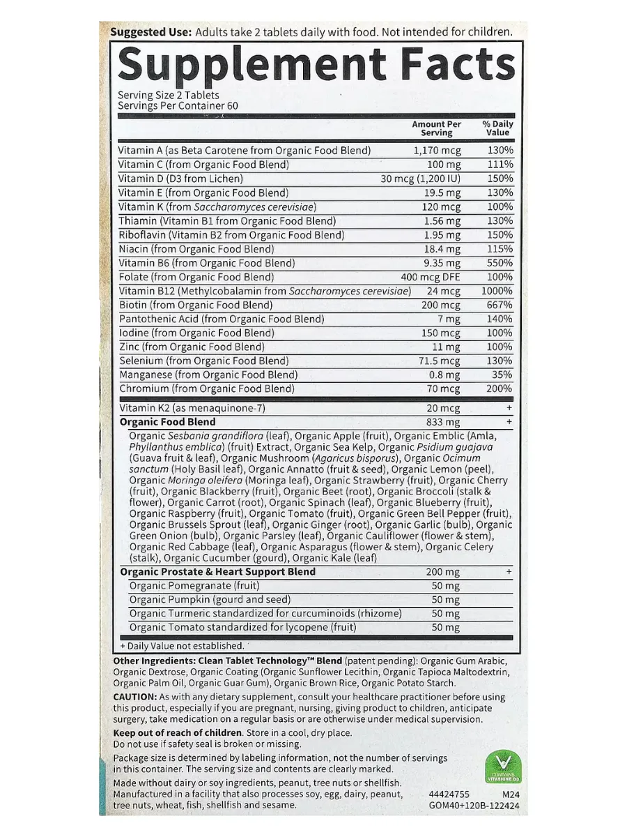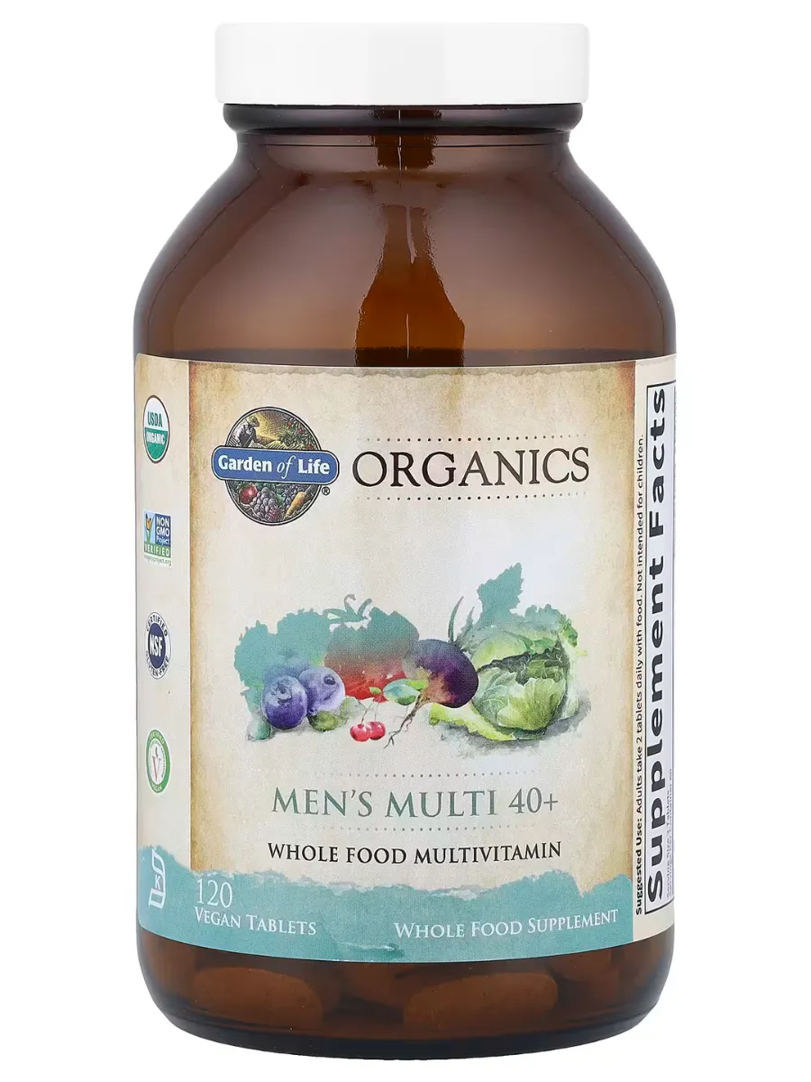 Garden of Life Organics Men's Multi 40+ — это органический мультивитаминный комплекс из цельных пищевых продуктов, специально разработанный для мужчин старше 40 лет. Каждая порция (2 веганские таблетки) содержит 20 витаминов и минералов, включая 1000% дневной нормы витамина B12 (в форме метилкобаламина) для энергии и метаболизма, 15 мкг витамина D3 из лихена для здоровья костей и иммунитета, а также цинк, селен и магний для поддержки простаты, сердца и общего тонуса. Продукт включает более 30 органических фруктов, овощей и трав (куркума, томаты, чёрный кохош и др.) для антиоксидантной защиты и гормонального баланса. Не содержит ГМО, глютен, сою, молочные продукты, искусственные красители, наполнители или консерванты, подходит для веганов и сертифицирован по стандартам USDA Organic, Non-GMO Project, NSF Gluten-Free и кошерности.