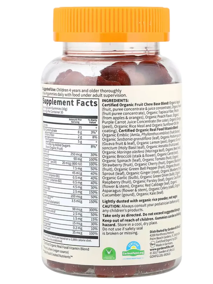 Garden of Life MyKind Organics Kids Multi — это детские мультивитамины в форме мармеладных мишек со вкусом органических фруктов, разработанные для поддержки здоровья и роста детей. Каждая порция (4 мармеладные таблетки) содержит 17 витаминов и минералов, включая 20 мкг (800 МЕ) витамина D3 из лихена для здоровья костей и иммунитета, 12 мг витамина C из органической амлы для антиоксидантной защиты и 2,4 мкг витамина B12 для энергии. Продукт включает 9 органических фруктов, таких как яблоко, персик и вишня, без добавления сахара или синтетических витаминов. Не содержит ГМО, глютен, молочные продукты, сою, желатин, искусственные ароматизаторы или красители, подходит для веганов и сертифицирован по стандартам USDA Organic, Non-GMO Project, NSF Gluten-Free и кошерности.
