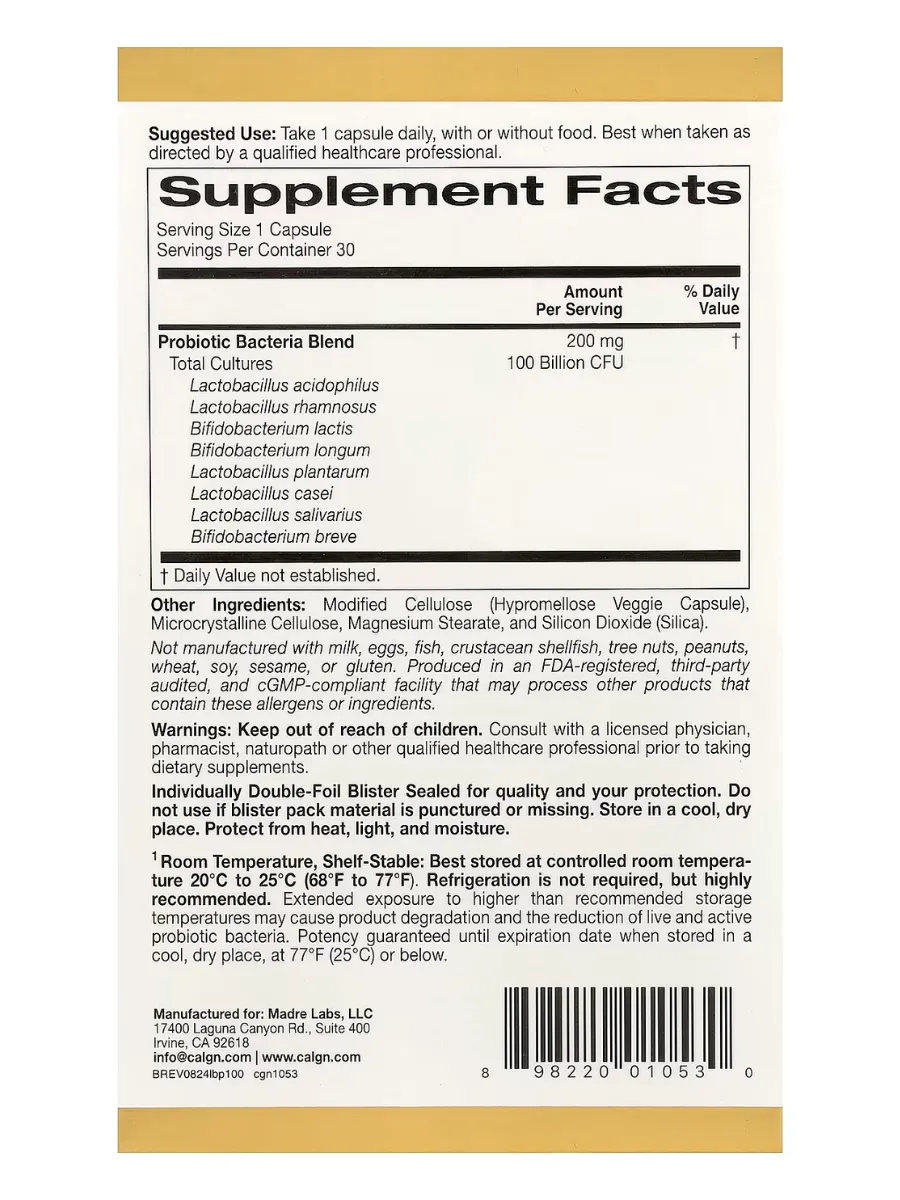 LactoBif 100 от California Gold Nutrition — это мощный пробиотический комплекс с высокой концентрацией живых культур. Каждая капсула содержит 100 миллиардов КОЕ и включает 8 тщательно подобранных штаммов пробиотиков, поддерживающих здоровье пищеварительной системы и иммунитет.