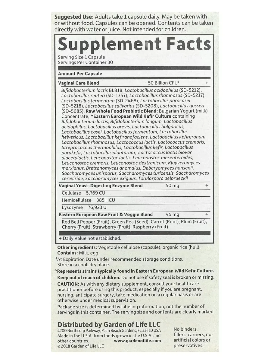 Garden of Life RAW Probiotics Vaginal Care — это высокоэффективная пробиотическая добавка на основе цельных продуктов, специально разработанная для поддержки женского здоровья. Продукт помогает сохранить здоровый баланс микрофлоры влагалища и мочевыводящих путей, а также способствует улучшению пищеварения и иммунной функции.