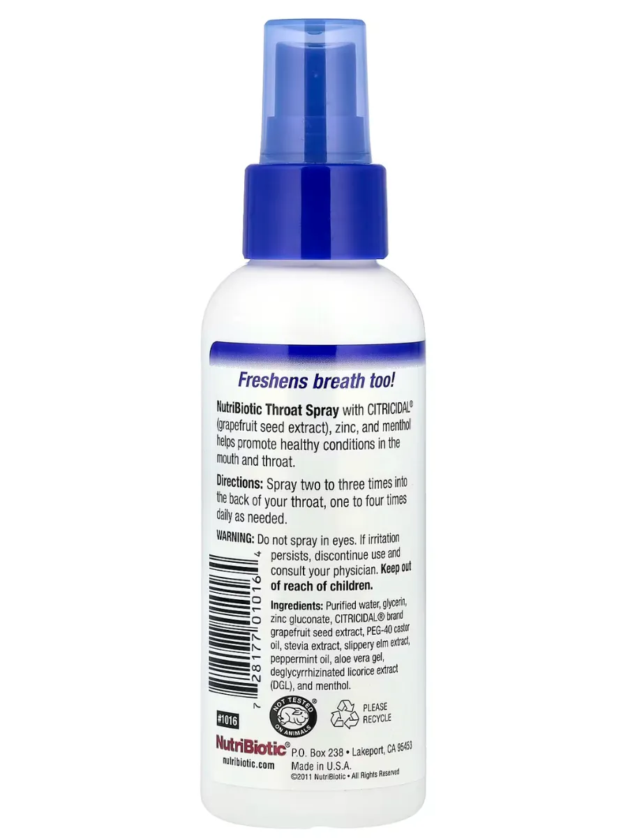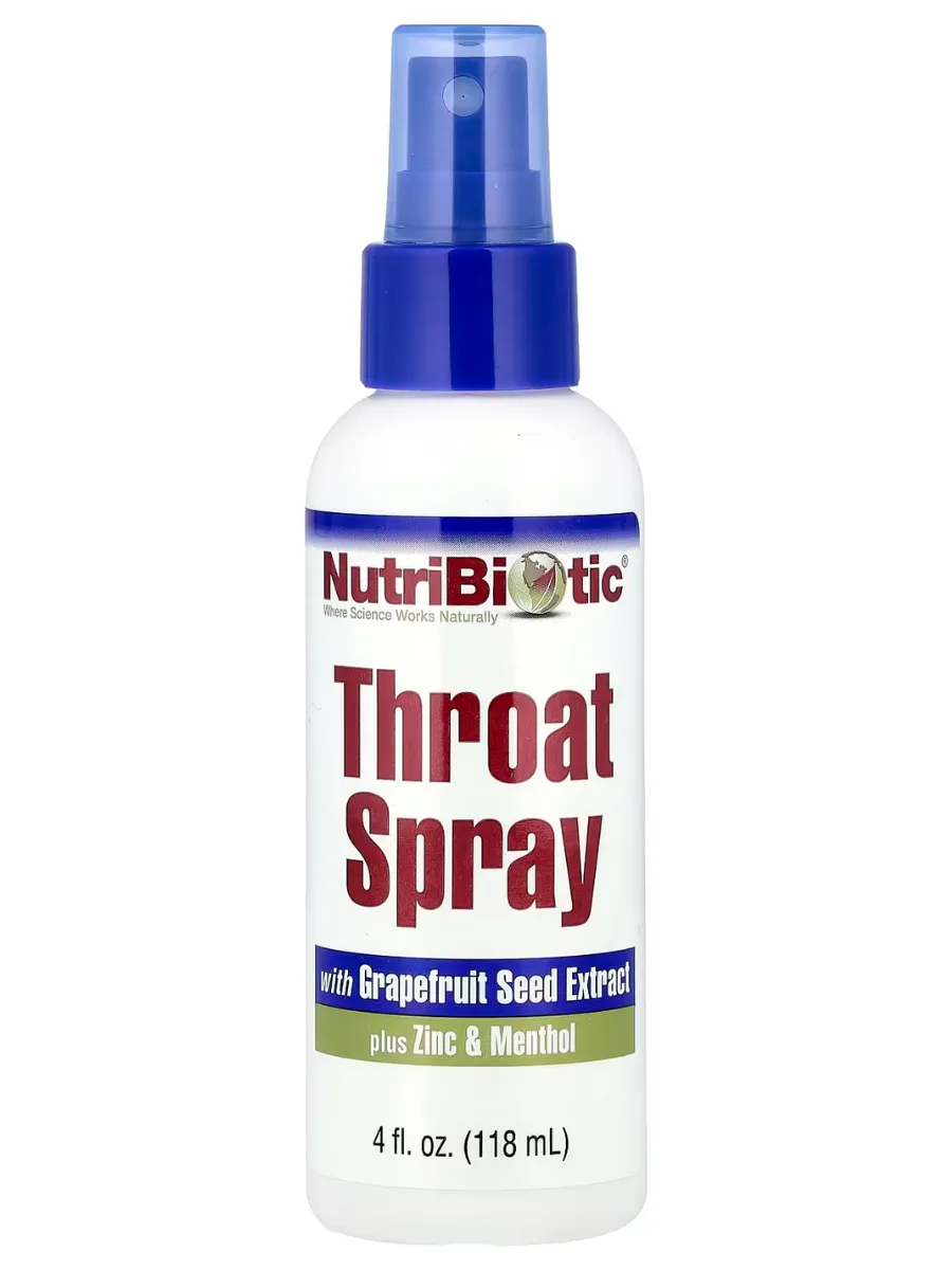 NutriBiotic Throat Spray — это натуральный спрей для горла, разработанный для поддержания здоровья полости рта и горла. Формула сочетает в себе экстракт косточек грейпфрута Citricidal, цинк и ментол, обеспечивая антисептическое, противовоспалительное и освежающее действие.