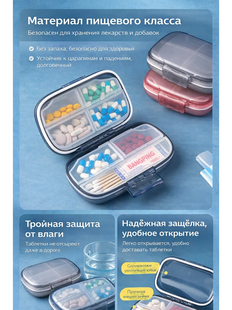 Удобная и вместительная таблетница для тех, кто принимает несколько видов таблеток, витаминов или БАДов и часто бывает в дороге. Подходит для поездок, работы, спортзала и повседневного ношения с собой.