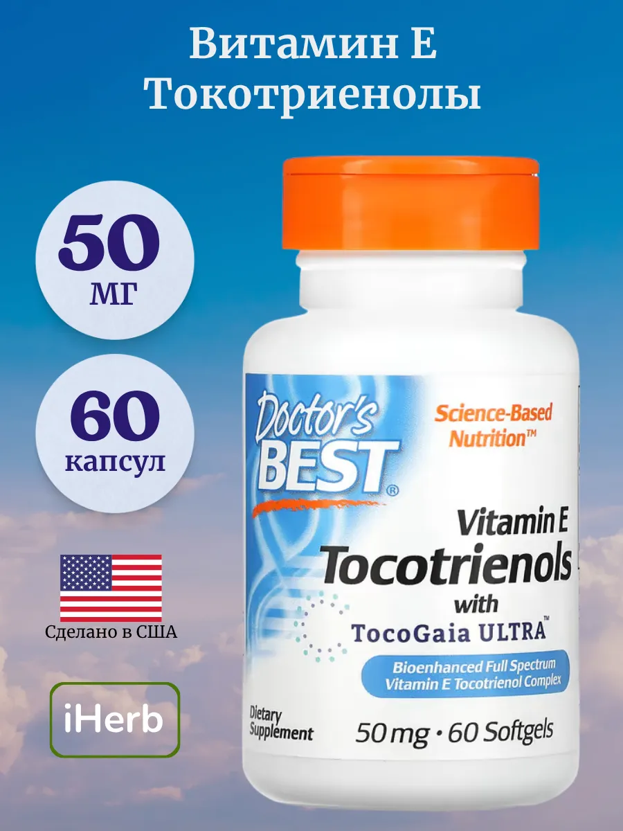 Doctor's Best Tocotrienols with Vitamin E — это антиоксидантный комплекс для поддержки здоровья сердца, мозга и иммунной системы. Каждая порция (1 мягкая таблетка) содержит 50 мг токотриенолов, полученных из устойчивого красного пальмового масла Elaeis guineensis, и 13,4 мг витамина E в форме d-альфа-токофенола, обеспечивая защиту клеток от свободных радикалов. Продукт улучшает усвоение благодаря уникальной эмульгирующей формуле и поддерживает нормальный уровень холестерина. Не содержит ГМО, глютен, сою, искусственные красители или консерванты, сертифицирован по стандартам GMP.
