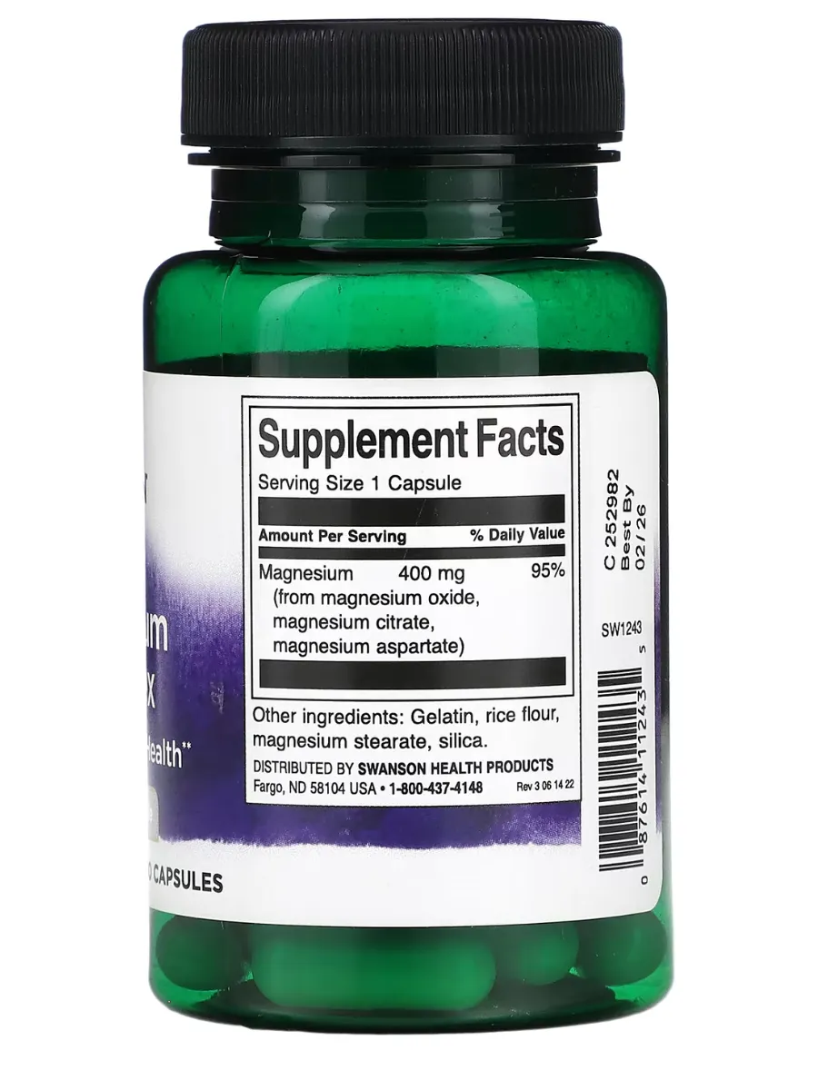 Swanson Тройной Комплекс Магния — это высокоэффективная формула, содержащая три формы магния (оксид, цитрат и аспартат) для максимального усвоения и поддержки нервной системы, мышечной функции и здоровья костей.
