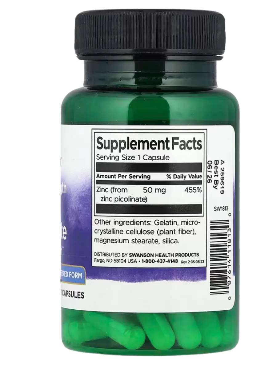 Swanson Пиколинат цинка — это минеральный комплекс повышенной силы действия для поддержки иммунитета и общего здоровья. Каждая порция (1 капсула) содержит 50 мг цинка в форме пиколината, которая отличается высокой биодоступностью и легко усваивается организмом. Цинк способствует антиоксидантной защите, поддерживает здоровье кожи, простаты и зрения, а также участвует в более чем 300 ферментативных реакциях. Продукт разработан для ежедневного использования и не содержит искусственных добавок. Не содержит ГМО, глютен, сою, искусственные красители или консерванты, подходит для вегетарианцев и сертифицирован по стандартам GMP.