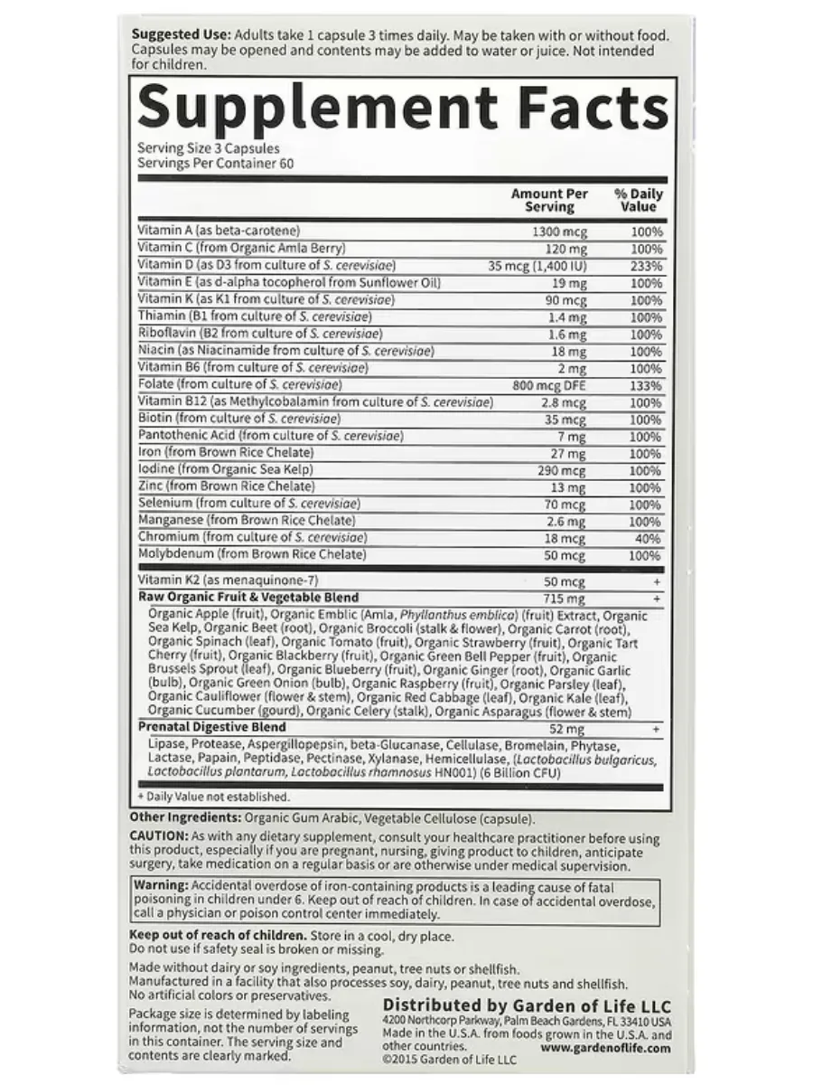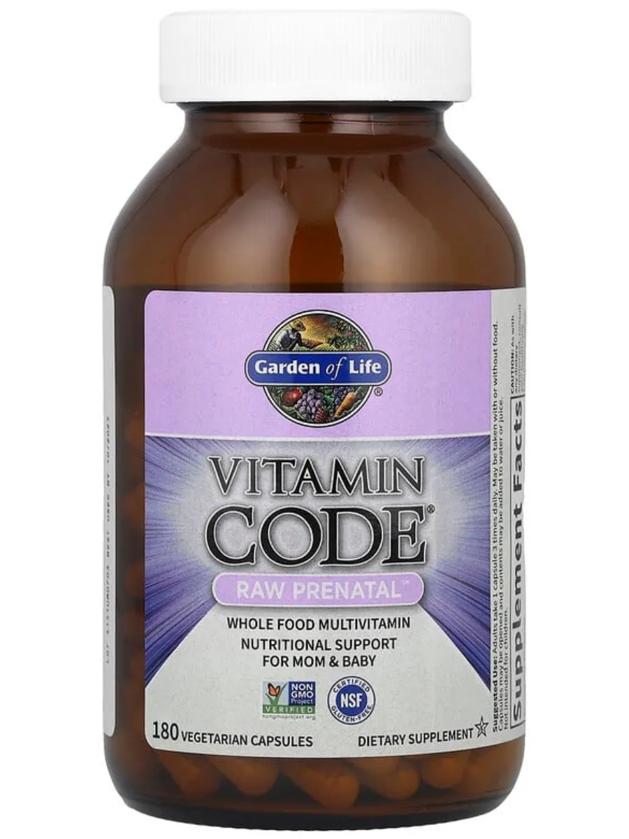 Garden of Life Vitamin Code RAW Prenatal — это комплексный мультивитаминный комплекс из цельных пищевых продуктов, разработанный для женщин на стадии подготовки к беременности, во время беременности и лактации. Каждая порция (3 капсулы) содержит 23 витамина и минерала, включая 800 мкг фолата для здорового развития нервной трубки плода, 27 мг железа из органических источников для здоровья крови и репродуктивной системы, а также 35 мкг (1400 МЕ) витамина D3 для оптимального усвоения кальция. Продукт включает 23 органических фрукта и овоща, таких как яблоко, брокколи и имбирь, а также пробиотики и ферменты для поддержки пищеварения и иммунитета. Не содержит ГМО, глютен, сою, молочные продукты, искусственные красители, наполнители или консерванты, подходит для вегетарианцев и сертифицирован по стандартам Non-GMO Project, NSF Gluten-Free и кошерности.