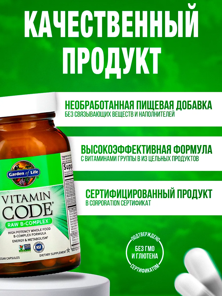 Garden of Life, Vitamin Code, Raw B-Complex — это натуральный комплекс витаминов группы B в сыром виде, специально разработанный для поддержки энергии, работы нервной системы и здоровья кожи, волос и ногтей. Продукт идеально подходит для тех, кто ищет веганский и органический источник витаминов группы B.