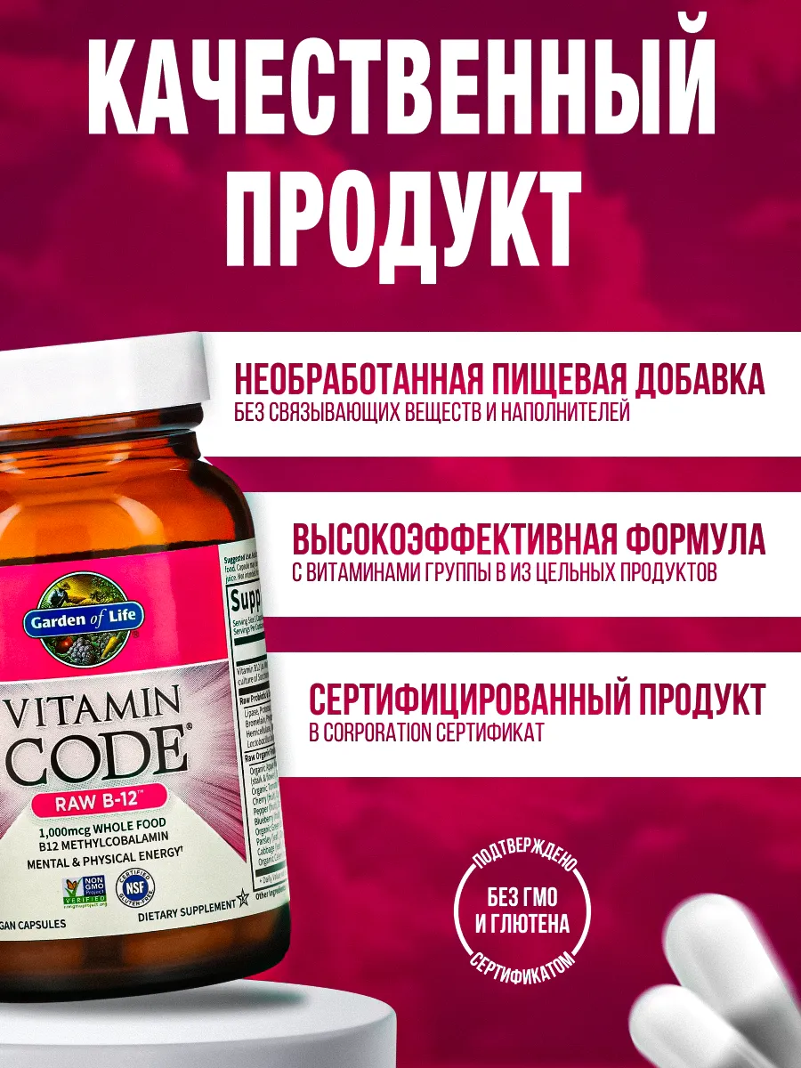Garden of Life Vitamin Code RAW B12 — это натуральная, цельнопищевая форма витамина B12, полученная из растительных источников, специально разработанная для поддержки энергии, здоровья нервной системы и метаболизма. Витамин B12 играет ключевую роль в образовании эритроцитов, работе мозга и поддержке общего самочувствия.