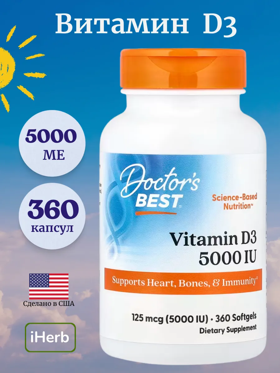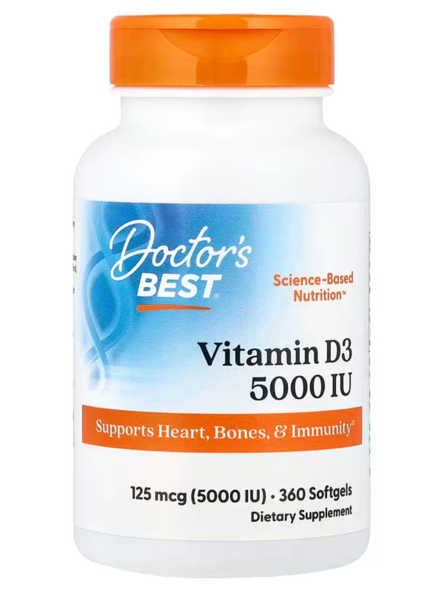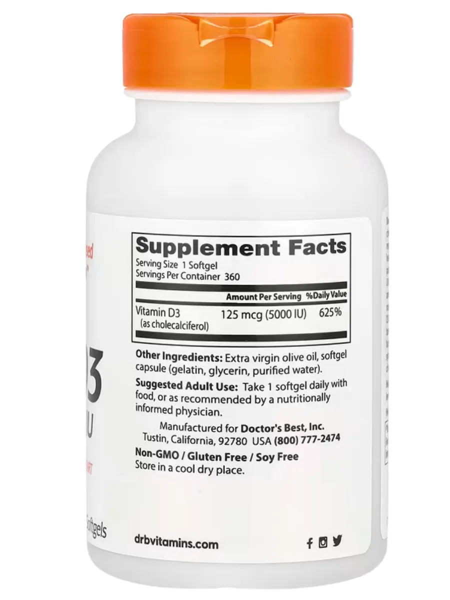 Doctor's Best Vitamin D3 — это витаминный комплекс, обеспечивающий высококачественный источник витамина D3 для поддержки иммунной системы, здоровья костей и сердца. Каждая порция (1 мягкая таблетка) содержит 125 мкг (5000 МЕ) витамина D3 в форме холекальциферола, полученного из ланолина, что способствует эффективному усвоению кальция и фосфора. Продукт растворён в оливковом масле первого отжима для улучшения биодоступности. Не содержит ГМО, глютен, сою, искусственные красители или консерванты, подходит для ежедневного использования.